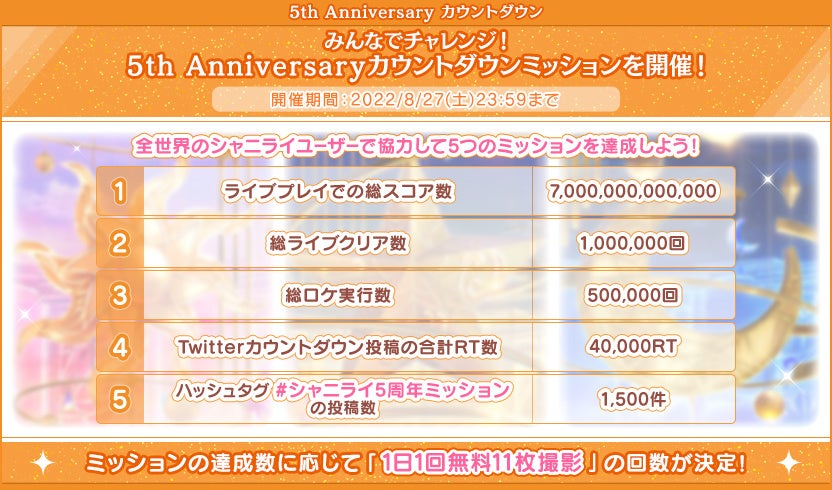 - ◆みんなでチャレンジ!5th Anniversaryカウントダウンミッションを開催!