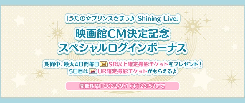 シャニライのCM公開決定を記念して、本日8月17日(水)より「うたの☆プリンスさまっ♪ Shining Live」映画館CM決定記念スペシャルログインボーナスを開催いたします。