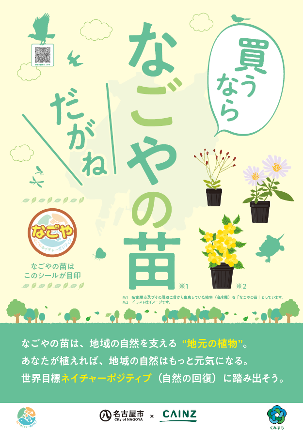 本協定に基づき、名古屋市内の全5店舗を通じて、生物多様性緑化(※)に資する在来種「なごやの苗」の普及に取り組み、生物多様性の理解促進に貢献します。