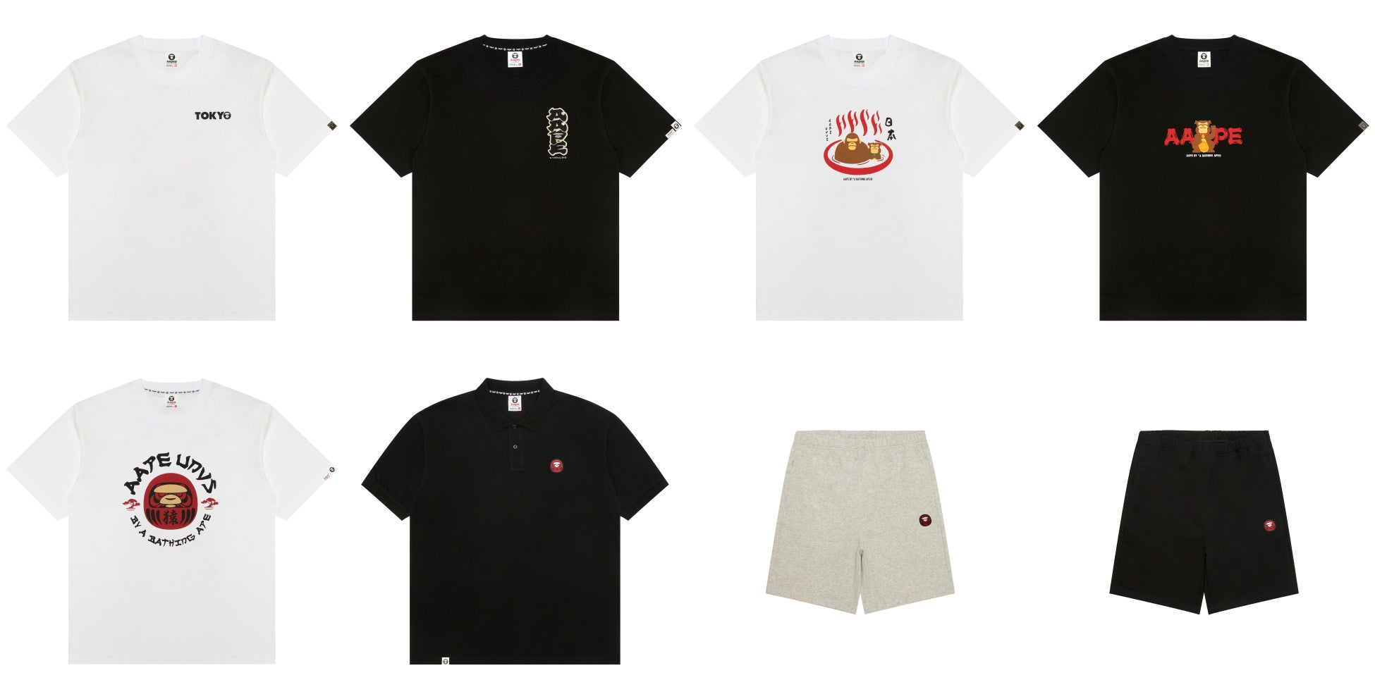 日本文化を象徴するモチーフをストリートスタイルに昇華し、『AAPE』の象徴である“MOON FACE”ロゴと日本の“だるま”を融合した新しいグラフィックや、桜、富士山、温泉、東京タワーなどをモチーフとしたユニークなイラストが登場。クラシックと革新が共存する、ストーリー性のあるデザインのアイテムが揃います。