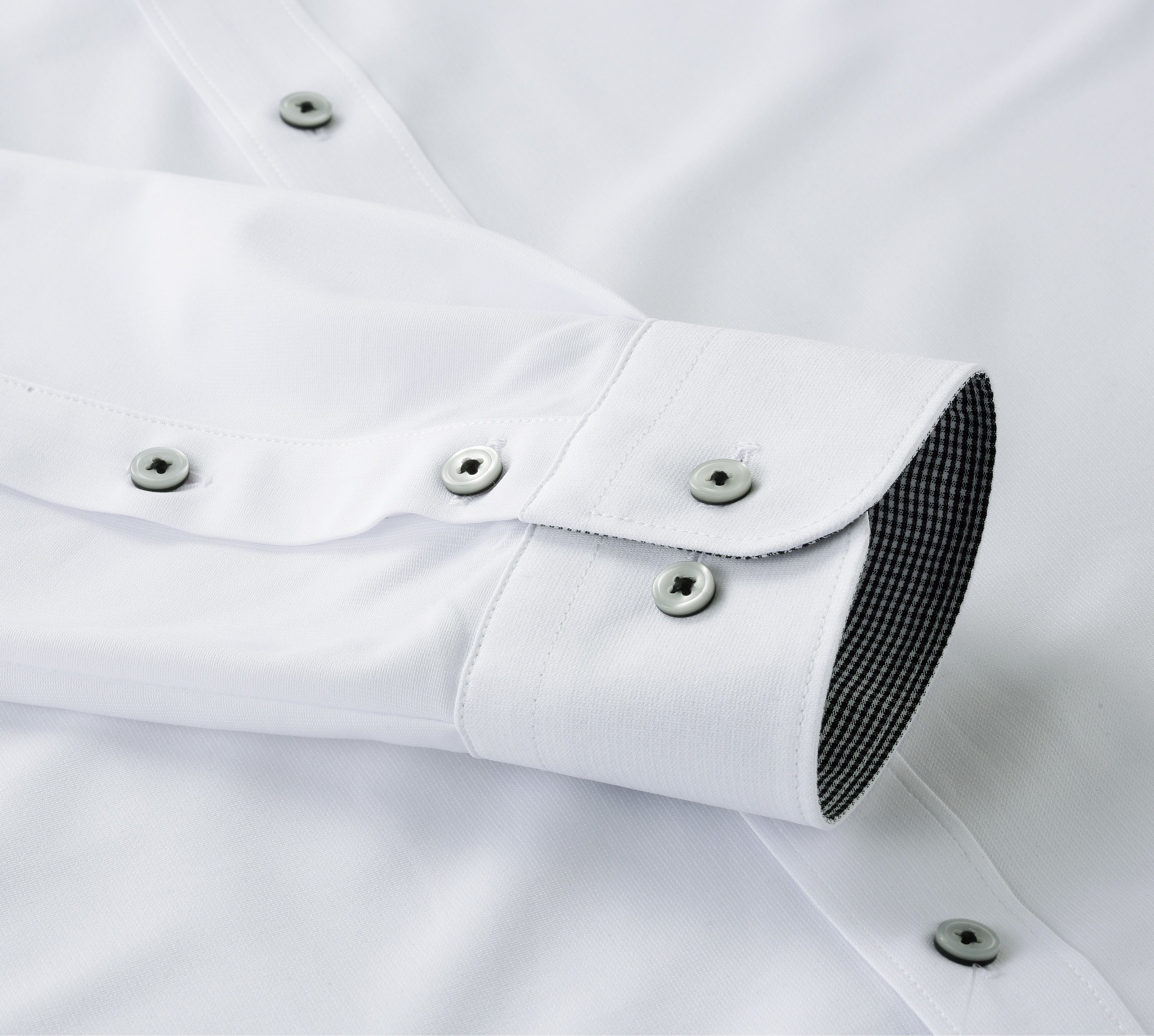 夏でも長袖シャツを着用するビジネスパーソンが、袖をまくる機会が多いことを受け、「スマートボタン」を付加。袖口の2つボタンで、折り上げ位置の調整が可能です。