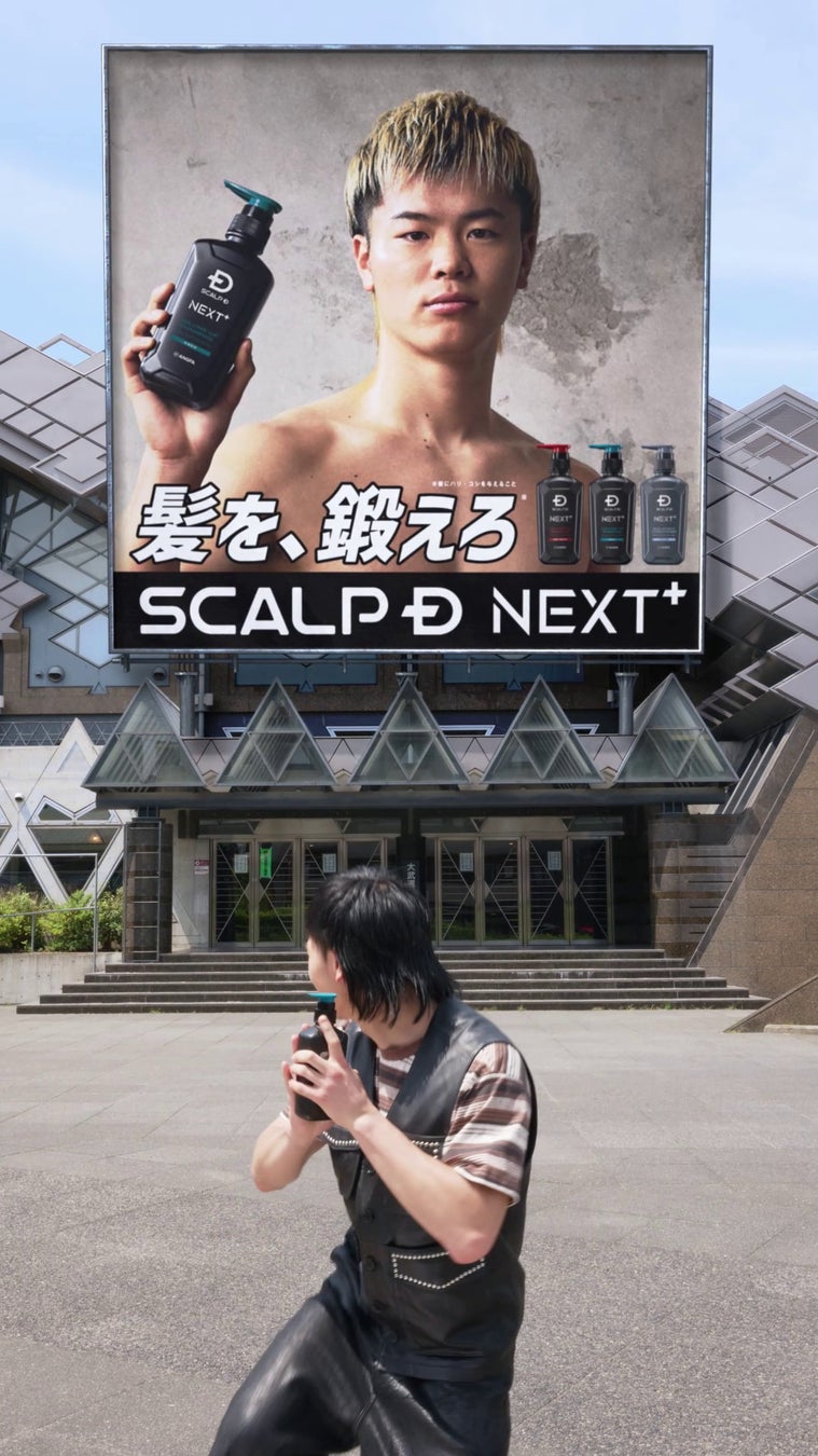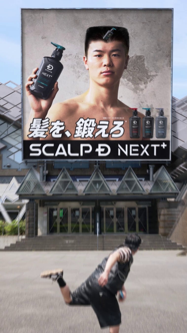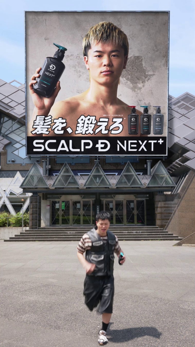 動画は街頭広告(OOH)を背景に、カメラに向かって走ってくる那須川天心選手の姿から始まります。天心選手は「今からこの看板の髪型変えちゃいたいと思います!」と宣言し、手元の「スカルプD NEXT+」のボトルを看板に向かって投擲します。すると1投目の結果、看板内の天心選手が角刈りスタイルに変化。これを見た天心選手は「親に怒られそう!(笑)」と率直にコメントします。