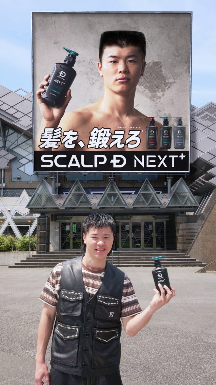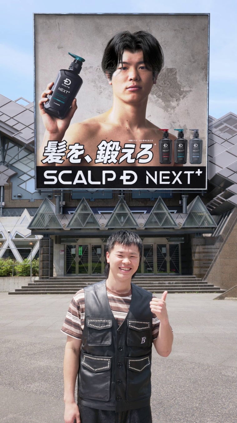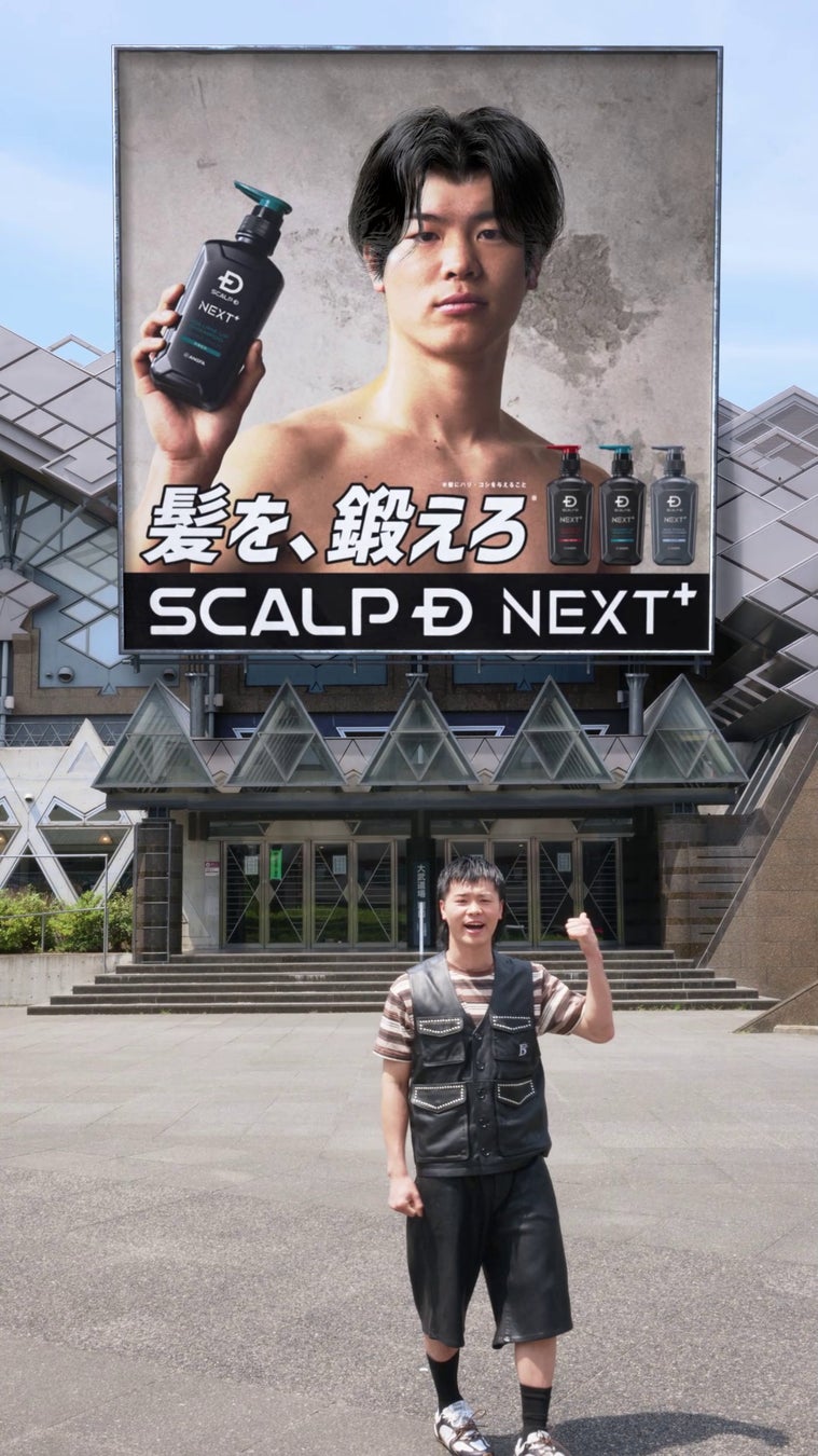 動画は街頭広告(OOH)を背景に、カメラに向かって走ってくる那須川天心選手の姿から始まります。天心選手は「今からこの看板の髪型変えちゃいたいと思います!」と宣言し、手元の「スカルプD NEXT+」のボトルを看板に向かって投擲します。すると1投目の結果、看板内の天心選手が角刈りスタイルに変化。これを見た天心選手は「親に怒られそう!(笑)」と率直にコメントします。