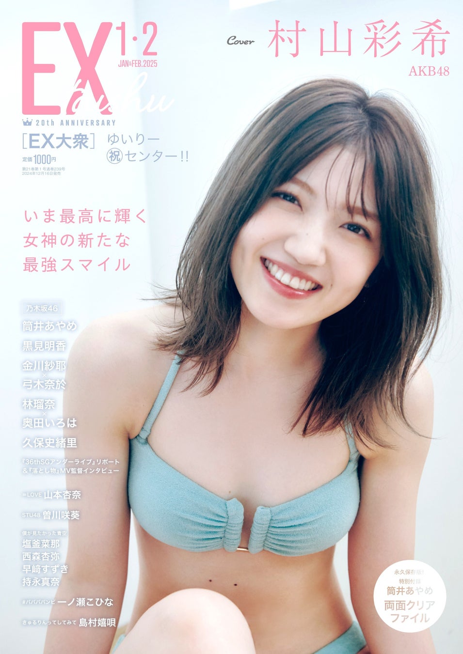 「AKB48の村山彩希です。12月16日発売のEX大衆さん、Amazon版限定で表紙をさせていただいております。なんとセブンネットでご購入いただくとポストカードがつくみたいなので。けっこうかわいらしく、アイドルっぽくなく、普段の私が見えるような一面がたくさんあると思うので、是非ゲットしてください。よろしく~!」