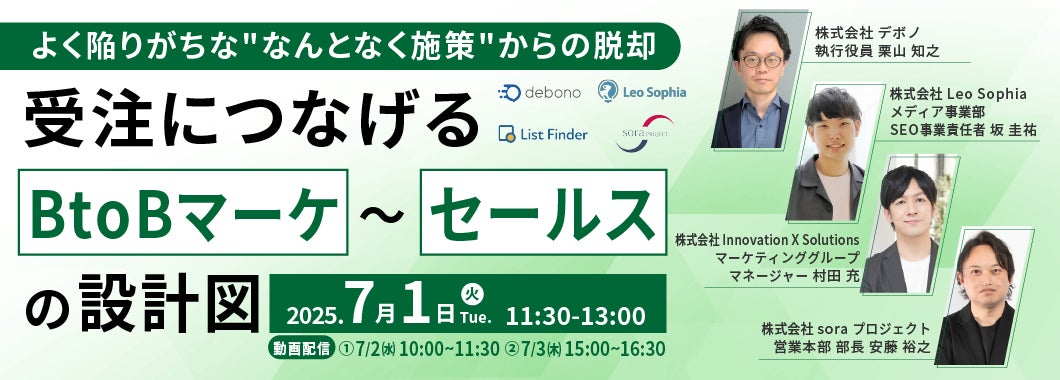 株式会社イノベーション(東証グロース 証券コード3970)のグループ会社である、株式会社Innovation X Solutions(本社:東京都渋谷区、代表取締役社長:歐陽 聖司、以下「Innovation X Solutions」)は、2025年7月1日(火)に「受注につなげるBtoBマーケ ~ セールスの設計図、よく陥りがちな"なんとなく施策"からの脱却」をテーマとしたセミナーを、Leo Sophia社、soraプロジェクト社、デボノ社と共催で開催します。