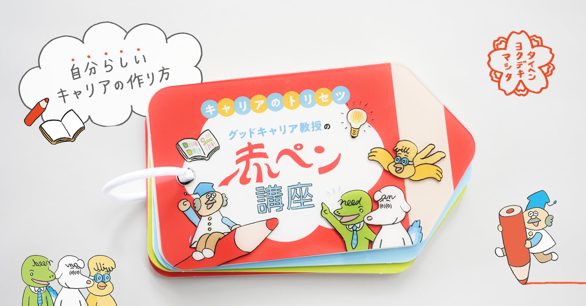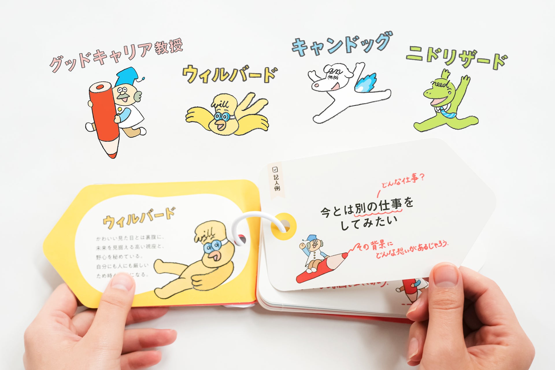 (記入例のカードには、グッドキャリア教授による心の奥の声を引き出すアドバイスが赤ペンで書かれており、めくるとそのアドバイスを反映した記入例を確認できます)