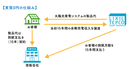 LIXIL TEPCO スマートパートナーズが余剰売電収入を得る代わりに、お客さまの太陽光発電システムのの製品代の割賦支払い負担を実質ゼロにします。ご契約期間は15年となります。