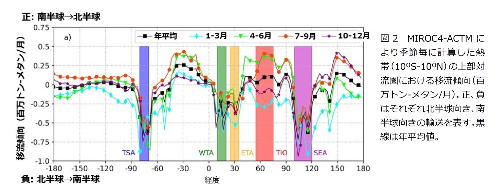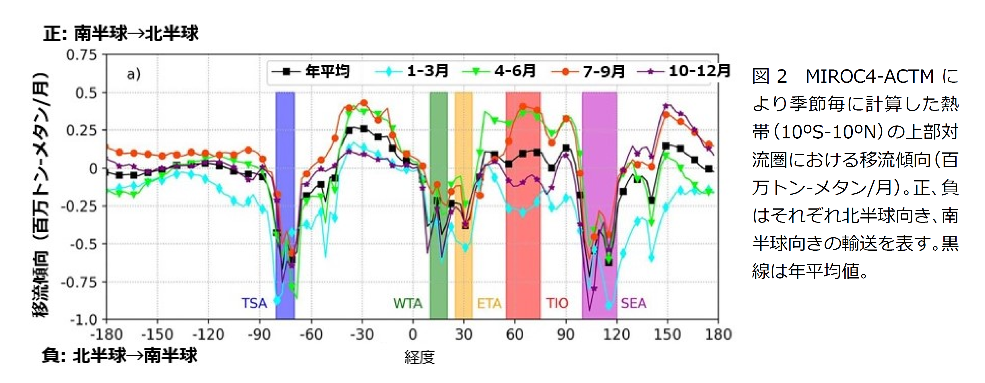 (2) これらの領域では移流傾向がどの季節も負(北半球から南半球へ輸送される)になっており、北半球で放出された物質が南半球へ輸送され、効率的に全球に「分配」される。一方、熱帯インド洋(図2:オレンジ)では夏モンスーンの影響で半球輸送に大きな季節性があること、熱帯アフリカも東西(緑と黄)で夏モンスーンの影響が異なっている。