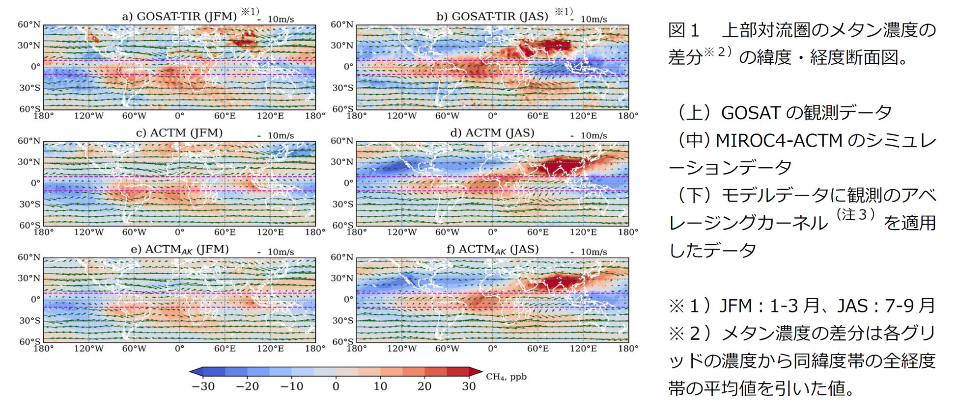 熱帯での物質の輸送経路や半球輸送における夏モンスーンの役割はこれまで十分に解明されていませんでしたが、日本の衛星GOSATに搭載されたセンサTANSO-FTSの熱赤外バンドで観測されたメタンの鉛直濃度分布データと、大気化学輸送モデルMIROC4-ACTM(注2)のメタンのシミュレーションデータを利用して、物質の半球輸送の経路に関する解析研究を行いました。