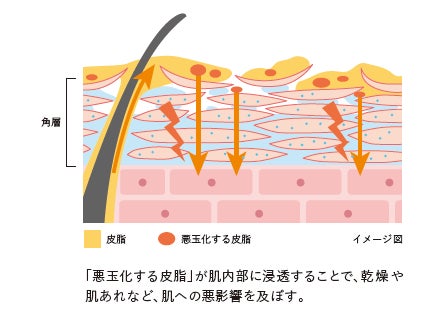 皮脂はうるおいを保ち、肌を保護する役割がある一方、皮脂の構成成分の一つである不飽和脂肪酸*は、分泌された皮脂中に占める割合が高くなるにつれて、“悪玉性質”を発現。「悪玉化する皮脂」が肌内部に再び浸透することで、バリア機能や水分量を低下させ、乾燥や肌あれの原因となります。