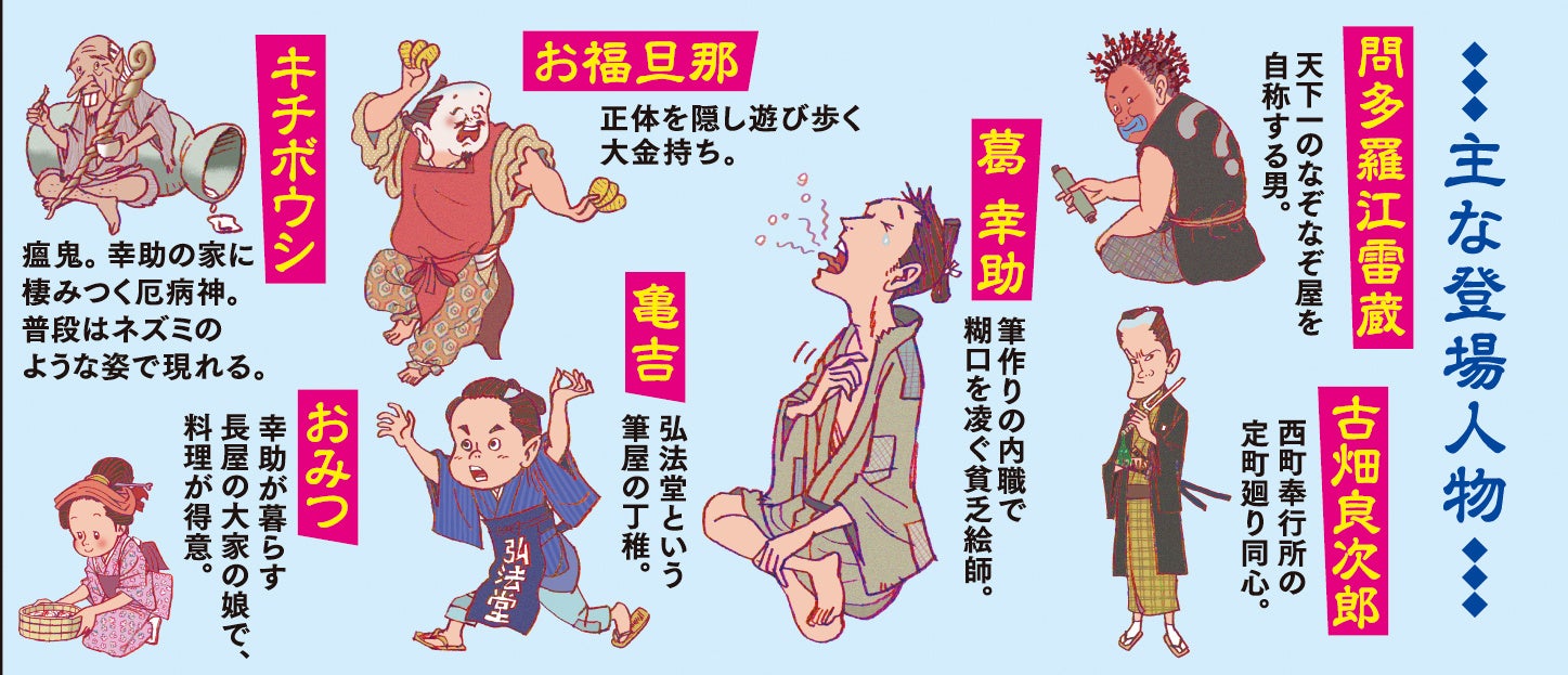 ある日、嫌われ者の小悪党が殺された。死体には下手人が残したと思われる奇妙な絵が。突き出した舌の上に大きな石を載せた閻魔大王。なぞなぞ? この事件を取り上げる瓦版に挿絵を依頼された絵師の幸助は、事件を調べはじめて……。大坂・福島の長屋に住む、貧乏神と呼ばれる絵師の幸助と、福の神と呼ばれる謎の商人。何もかも違うのに気の合う二人が、様々な難事件を解決していく。(書下し痛快時代小説)