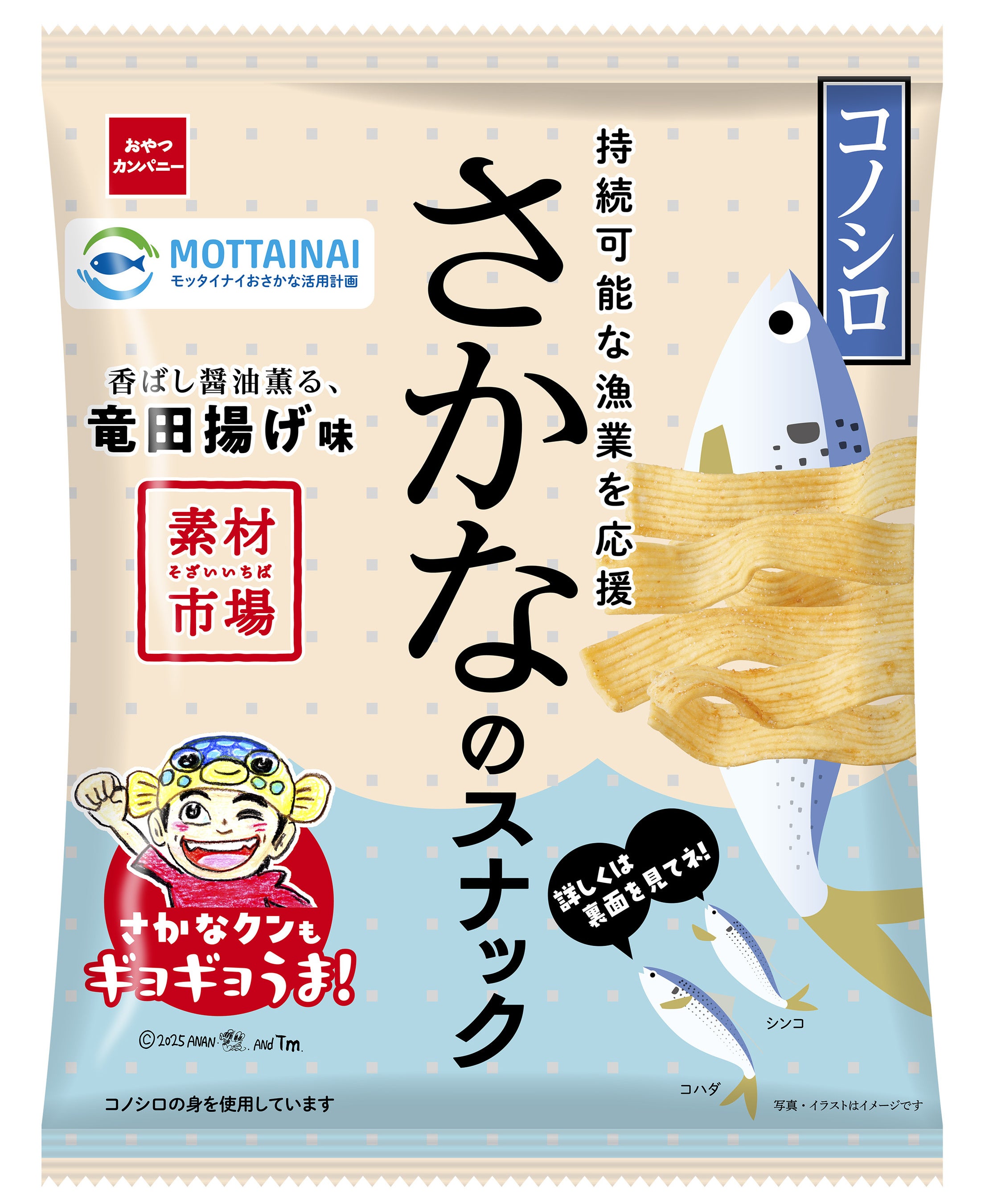 この“モッタイナイおさかな”として「コノシロ」に着目。魚介が持つ栄養素をおやつ感覚で手軽に摂れるスナック菓子として人気の『素材市場』シリーズの期間限定商品として、低流通魚・コノシロを使った『素材市場さかなのスナック(コノシロ 香ばし醤油薫る、竜田揚げ味)』を開発し、2025年10月27日(月)より、「モッタイナイおさかな活用計画」プロジェクト商品の第一号として期間限定で全国にて発売しています。
