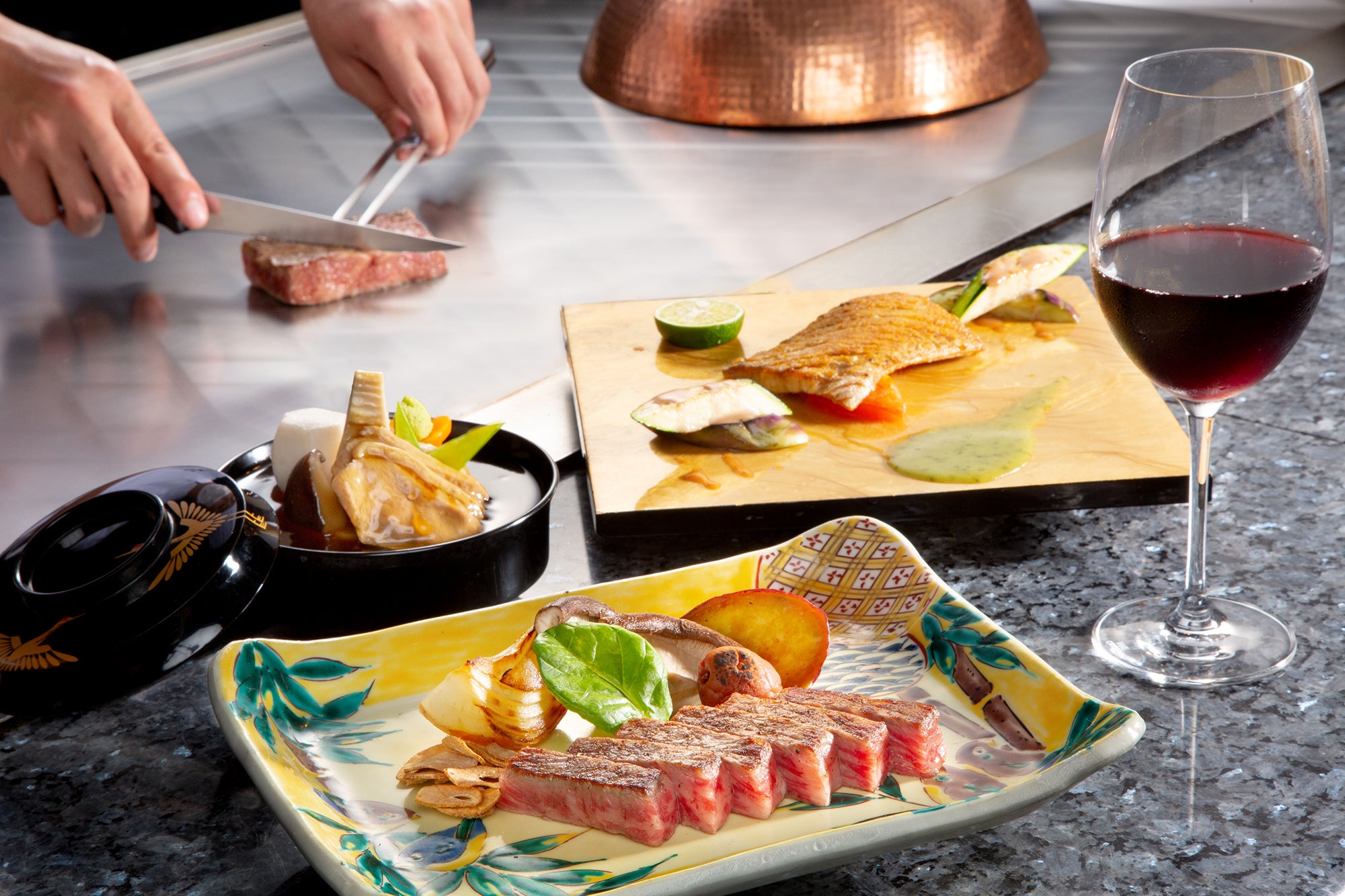 - 鉄板焼「青竹」加賀能登鉄板会席/厳選の山海の幸をシェフが目の前で焼き上げます。