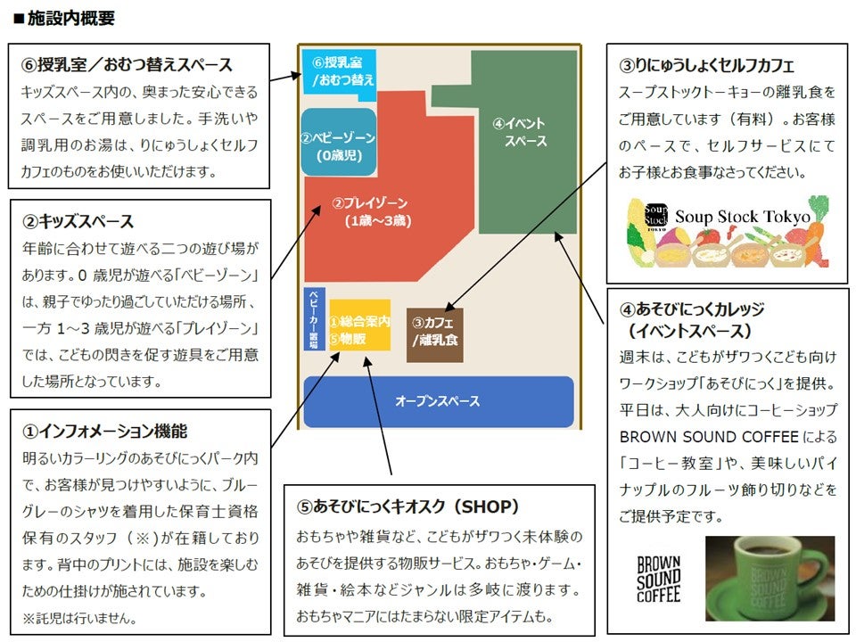 「あそびにっくパーク」は、これから本格的に暑い季節を迎える中で天候も気にせずに安心して、楽しく過ごすことができます。「①インフォメーション」の機能を核としながら、「②年齢に合わせて0歳児が遊べる“ベビーゾーン”/1~3歳児が遊べる“プレイゾーン”に分かれた2つの遊び場」、「③りにゅうしょくセルフカフェ」、「④あそびにっくカレッジ(イベントスペース)」、「⑤こだわり雑貨や玩具を体験した上で気軽に購入できる物販サービス」、「⑥おむつ替え/授乳室」 6つの異なる機能を1カ所に集約した施設です。