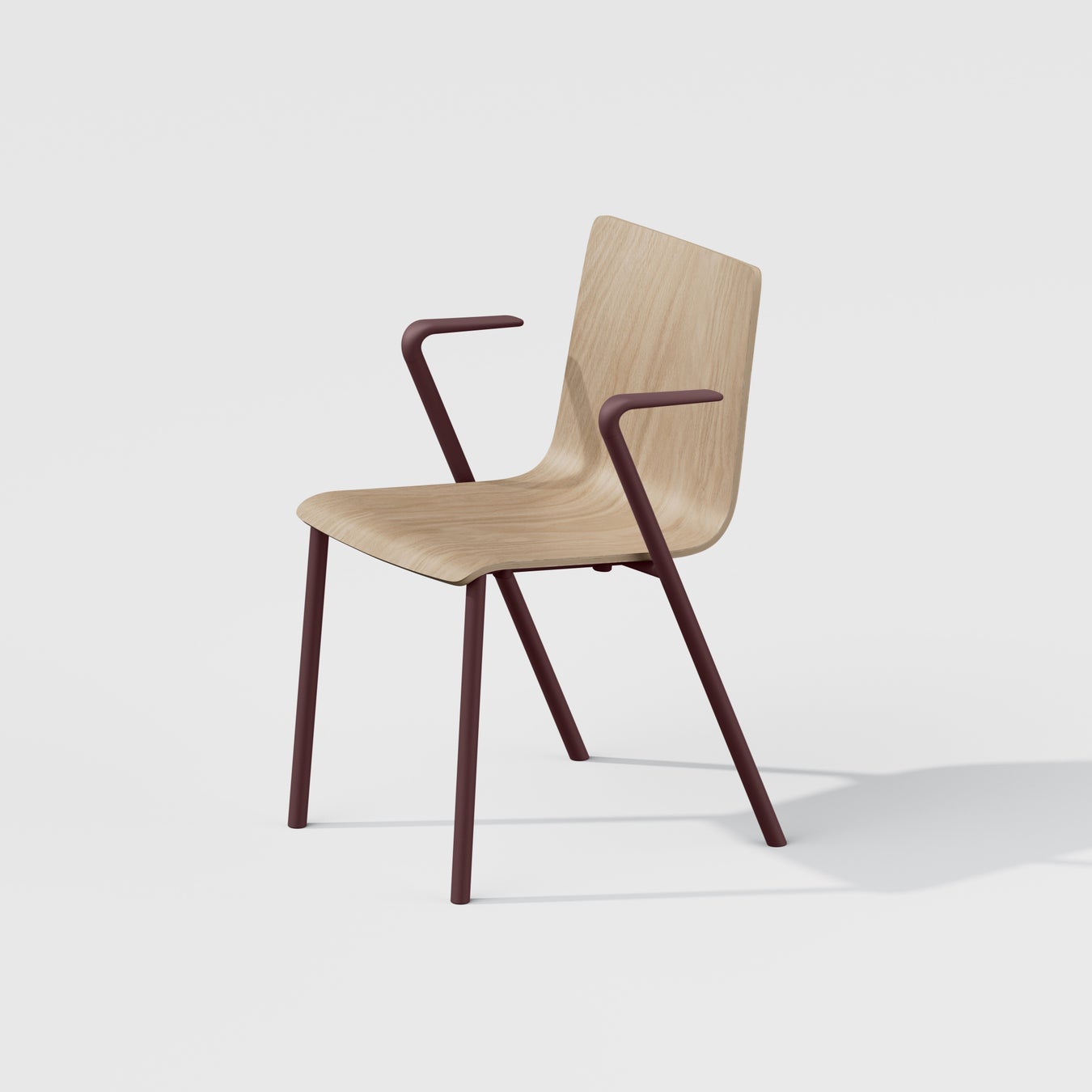 HAKUSANは、アルミダイキャストとスチールのフレームと1枚の合板シェルで作られた、個性と普遍性を兼ね備えたチェアです。フレームとアームレストが一体化した伸びやかなシルエットは、軽やかさと構造の強さを同時に表現し、静かでありながら確かな存在感を空間にもたらします。一般的なスタッキングチェアよりも太径のスチールパイプを採用することで、軽快さを保ちながらも、ダイニングチェアのような落ち着いた安定感を併せ持つ外観を実現しています。素材のコントラストとバランスの取れたプロポーションは、空間に自然と溶け込みながらも、さりげない個性を放ちます。