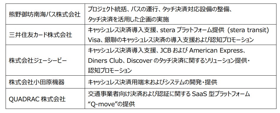熊野御坊南海バス株式会社(本社:和歌山県新宮市、取締役社長:植田 光昭)、三井住友カード株式会社(本社:東京都江東区、代表取締役社長:大西 幸彦)、株式会社ジェーシービー(本社:東京都港区、代表取締役兼執行役員社長:二重 孝好)、株式会社小田原機器(本社:神奈川県小田原市、代表取締役:丸山 明義)、QUADRAC株式会社(本社:東京都港区、代表取締役社長:高田 昌幸)、は2025年2月28日より、三井住友カードが提供する公共交通機関向けソリューション「stera transit」を活用した、タッチ決済対応のカード(クレジット、デビット、プリペイド)や、カードが設定されたスマートフォン等による乗車サービスを開始することを発表します。