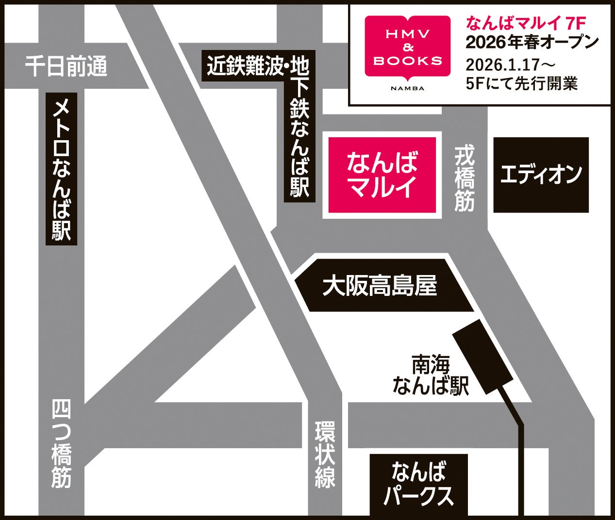 「HMV&BOOKS SHINSAIBASHI」および「HMV record shop 心斎橋」は、2026年1月12日(月・祝)の心斎橋オーパ閉館に伴い、「HMV&BOOKS SHINSAIBASHI」は2026年春に「HMV&BOOKS NAMBA」に店名を変更してなんばマルイ7階へ、「HMV record shop 心斎橋」は2026年3月13日(金)に心斎橋 大丸ホワイトアベニューにそれぞれ移転リニューアルオープンいたします。