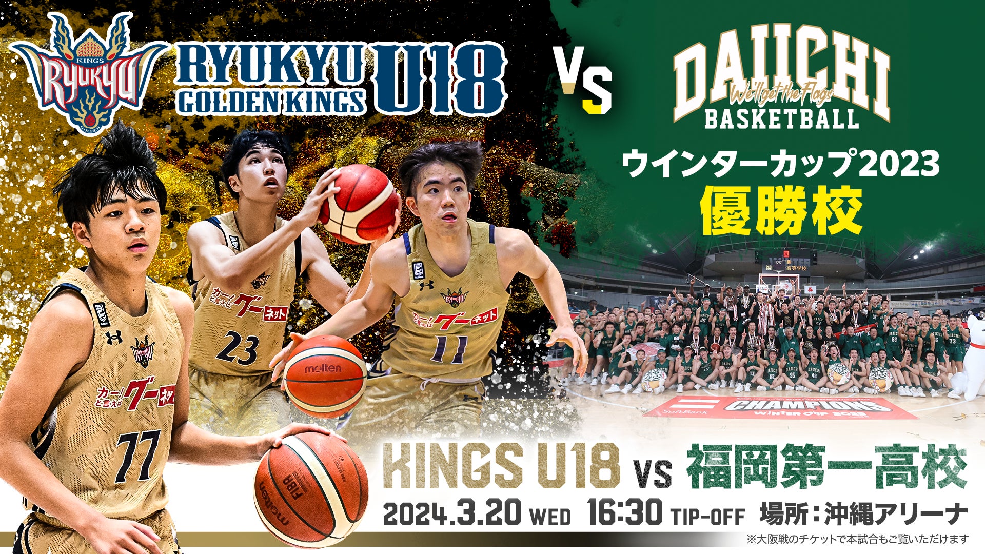 3月20日(水)に沖縄アリーナで行われる大阪エヴェッサ戦の前座試合にて、キングスU18とウインターカップ王者の福岡第一高等学校が対戦!大阪戦のチケットでキングスU18の試合も観戦できますので、ぜひ会場でキングスU18への後押しをよろしくお願いします!