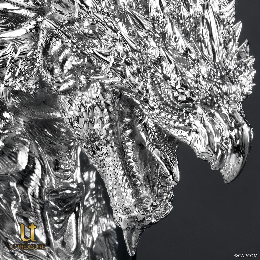 力強い眼差しや鋭い牙を持つ口元から鱗まで細部にまでこだわり、高さが約22㎝、プラチナタイプは重さが約750gと、素材を贅沢に使用して再現した迫力ある造形に。