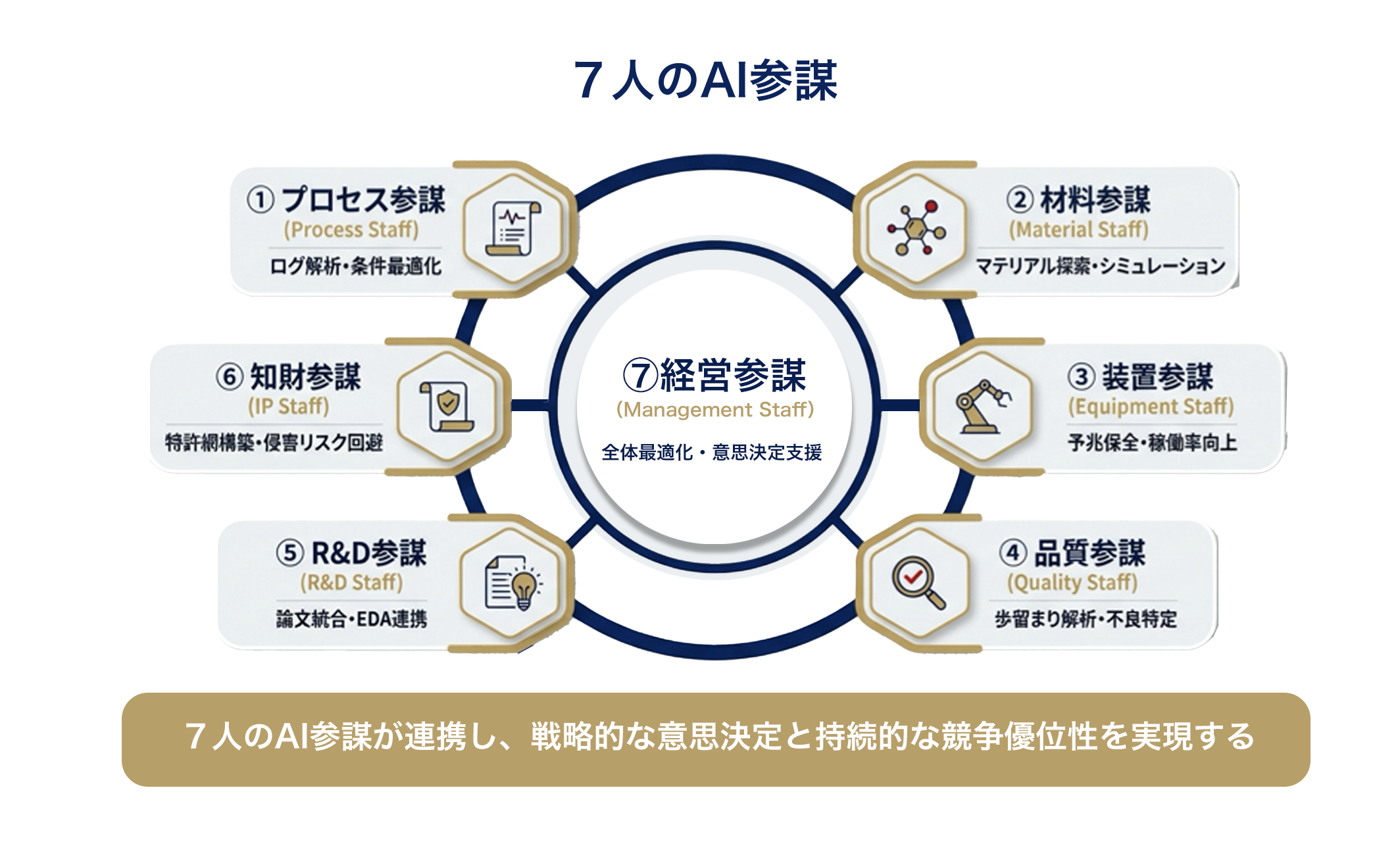 「AI ChipInfra on IDX」は、半導体の材料・プロセス・装置・設計・品質・知財・経営の7領域において、複雑かつ急速に進化する技術データ(プロセス条件・歩留まりデータ・特許情報・研究開発ログ)を統合・構造化し、製造最適化・技術継承・特許戦略・経営意思決定までを一貫して支援する「7参謀AI統合プラットフォーム」です。