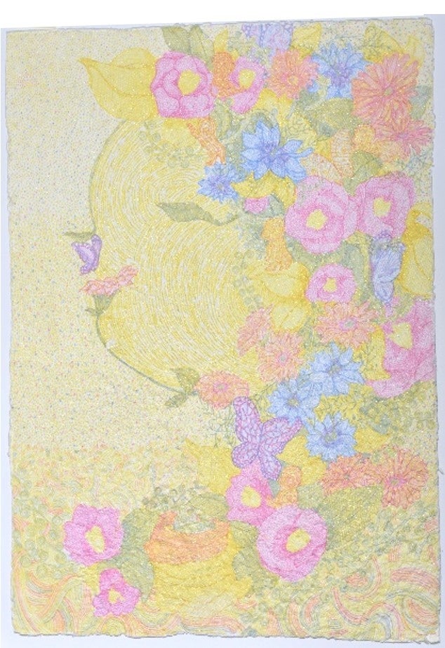「SminkArtペン*1」は持続可能な社会への次世代への贈り物と考え、支持体には牛乳パックをリサイクルして自作の紙を使用しました。アイカラーが自然由来であることから、「希望」「発展」「成長」を象徴するユッカ、サザンカ、ガーベラ、グリーンネックレスなどの植物で、未来の象徴として子供の横顔を描きました。また、未来が次世代を超えて続くことを表現するために、植物の中に小さな子供のシルエットをいくつか描き込みました。