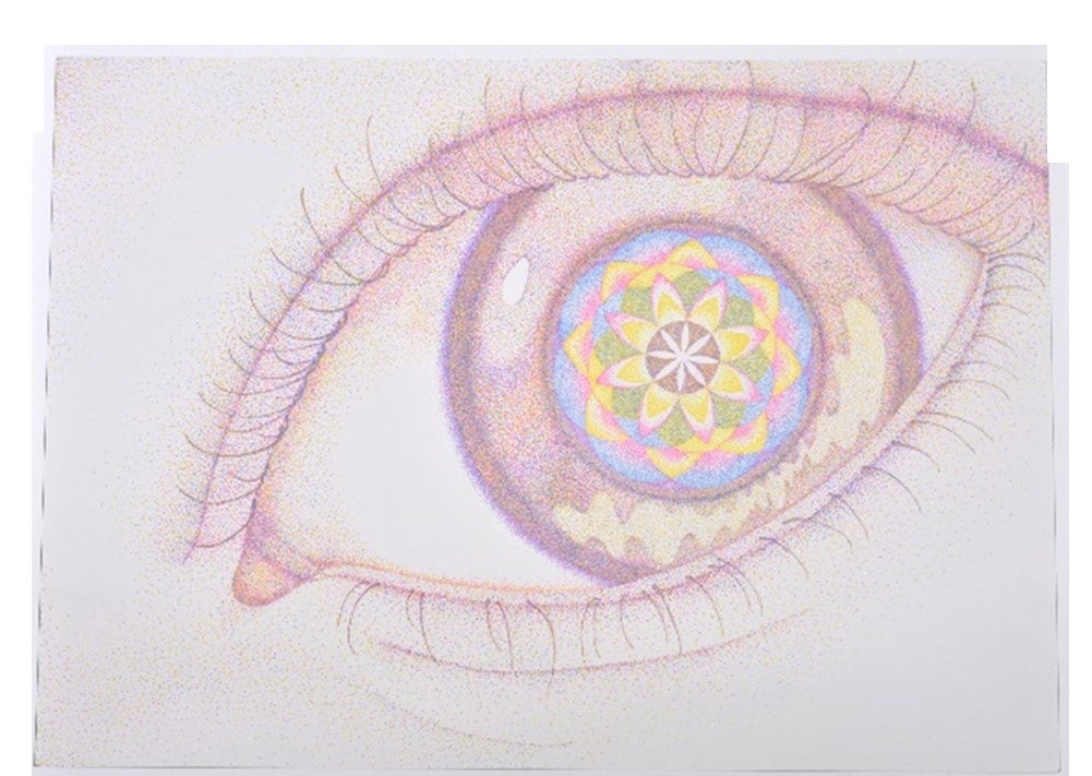 人種、性別関係なく、私たちの瞳に映る未来が彩りで溢れますようにと願いを込めて、点描で眼を描きました。また、印刷表現である「網点」は、色の重なり合いによってさまざまな色になることができます。本来規則正しいものである網点を手作業で描くことで、従来の考え方を壊したいという意味を込めました。1つ1つの点が人間だとしたら、多様性を尊重し、調和された社会はとても美しい未来をひらいてくれると信じています。