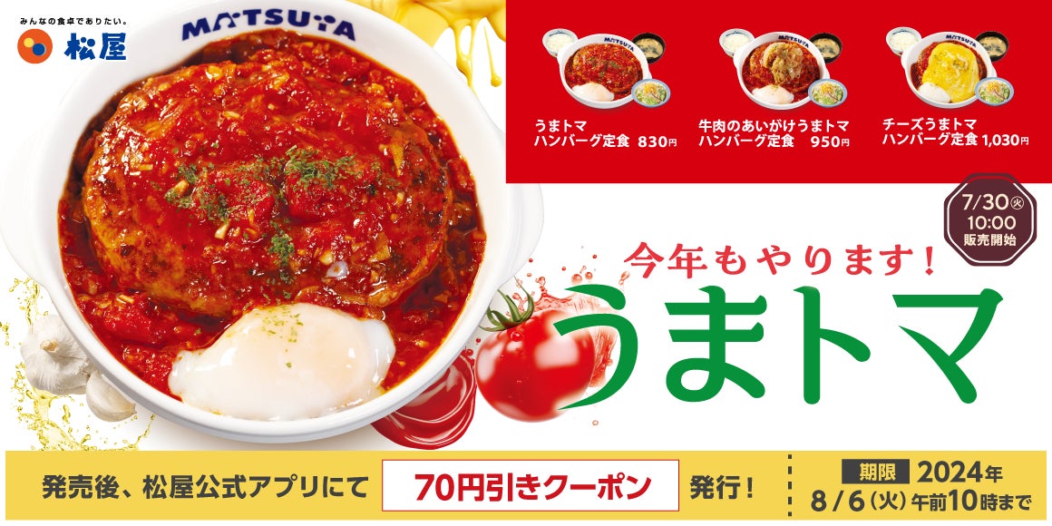 このたび松屋フーズ(本社:東京都武蔵野市、代表取締役社長:瓦葺一利)では、牛めし・カレー・定食・その他丼の「松屋」におきまして、2024年7月30日(火)10時より「うまトマハンバーグ」を販売いたします。