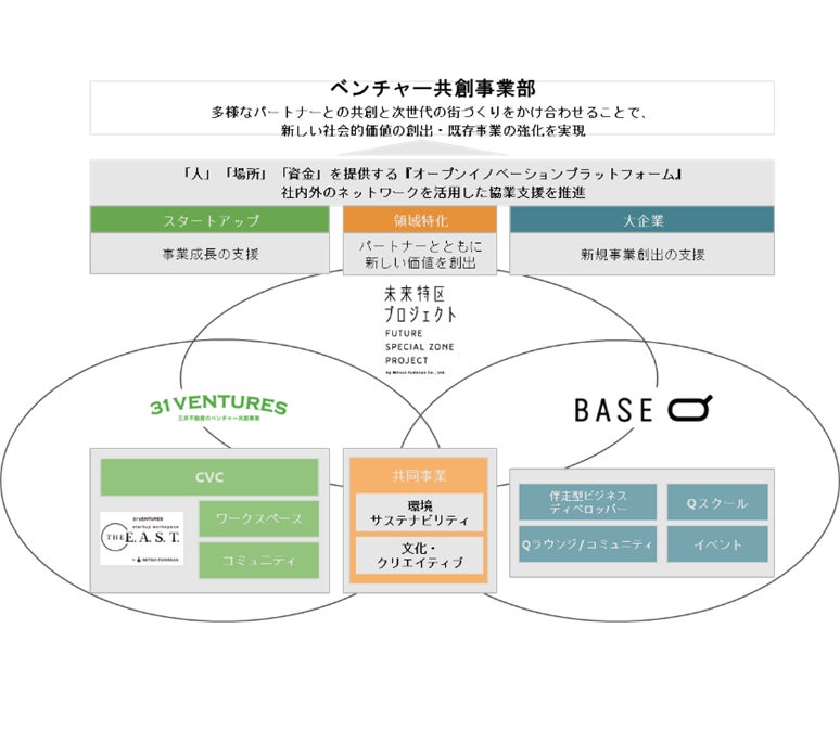 本事業を推進するベンチャー共創事業部は2015年に設立され、新しい社会的価値の創出・既存事業の強化を目指し、「31VENTURES」「BASEQ」「未来特区プロジェクト」の3つの事業を軸に多様なパートナーとの共創によるオープンイノベーションを推進しています。 |