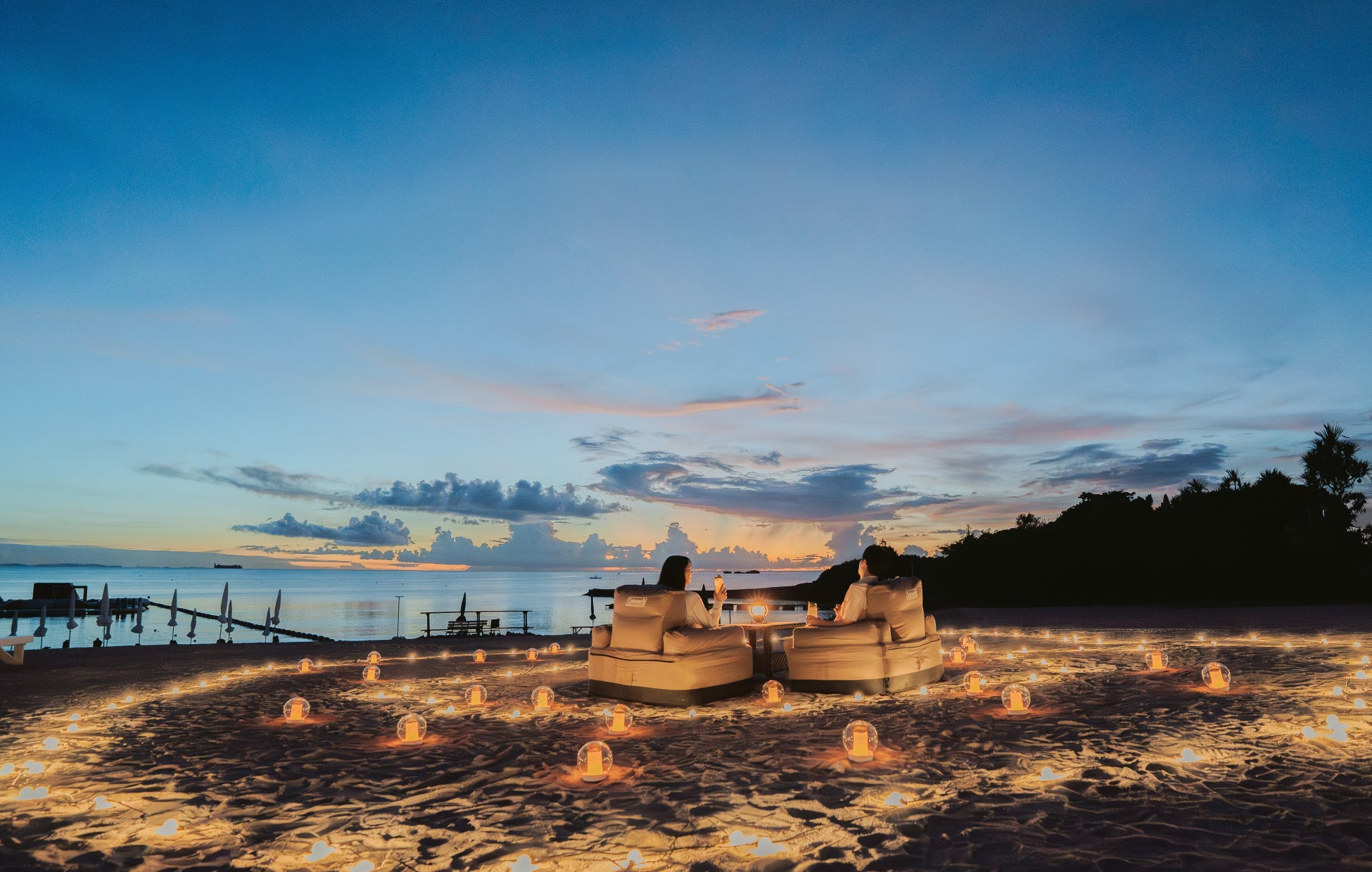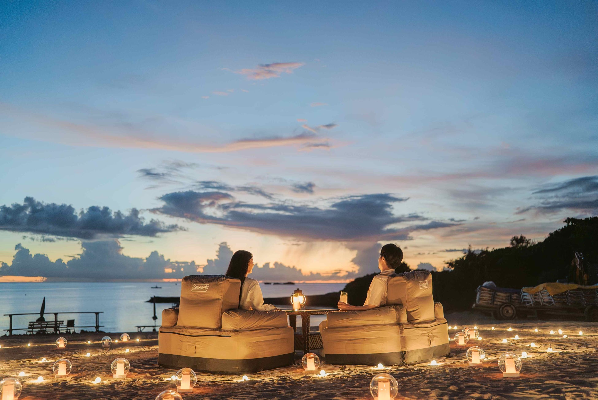 ガジュマルの小径を抜けて辿り着く残波ビーチでは、砂浜の上に設置したライトがビーチと夜の海を幻想的に照らし出します。アウトドアソファに寝ころび、波の音を聞き、潮風を感じながら幻想的に光るライトとその先に続く夜の海をぼんやり眺める、ビーチリゾートならではのイルミネーションが楽しめます。