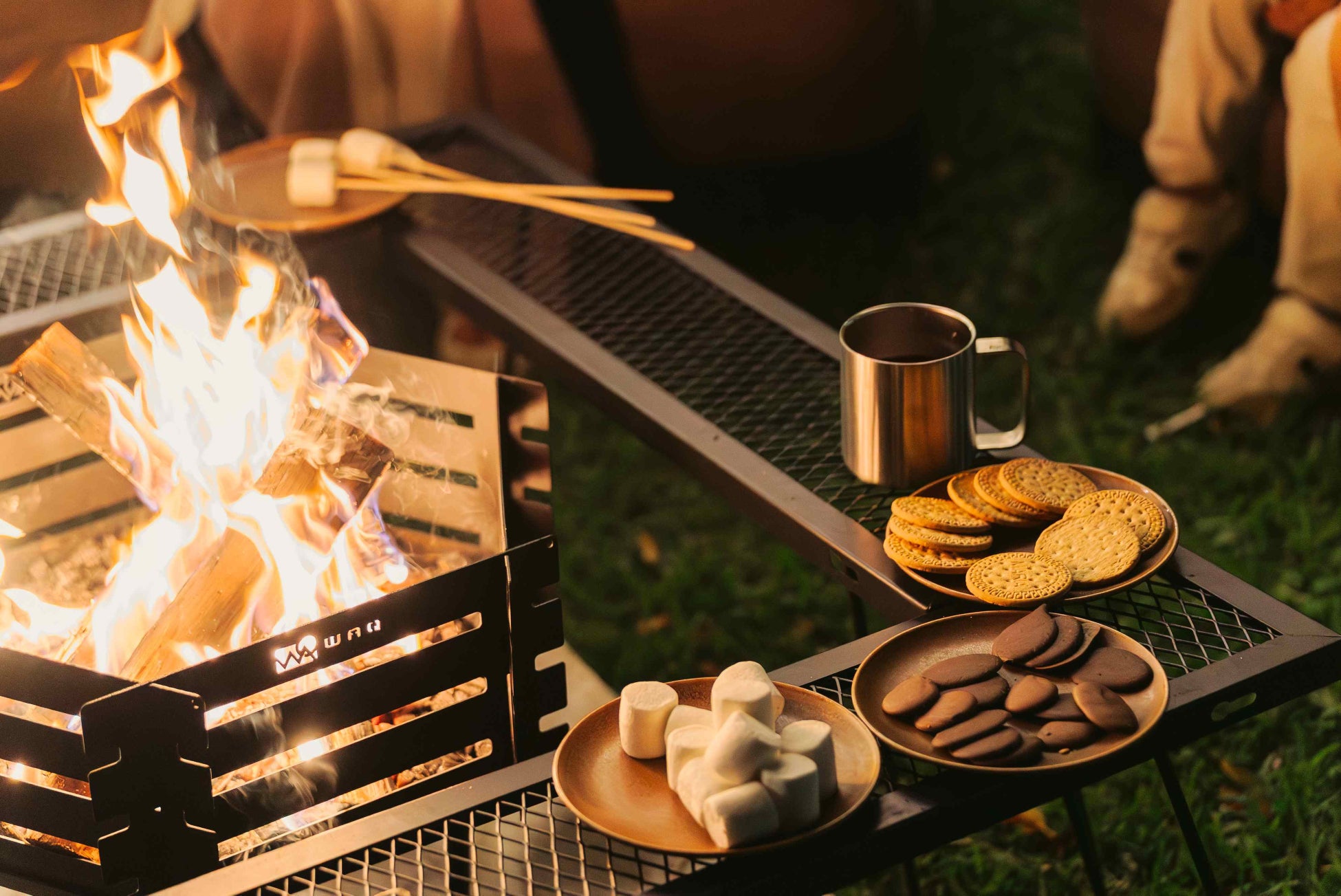 期間中にはファイヤーピットによる焚火を楽しめる日も用意し、焚火を使ってお客様自身で「スモア」を作っていただきます。「スモア(S'more)」とは、焼いたマシュマロとチョコレートをクラッカーで挟んで食べる、アメリカ発祥のアウトドアデザートです。「Some more!(もっと欲しい)」という名前の通り、マシュマロとチョコレートの甘さ、クラッカーの塩気が絶妙にマッチする、やみつきになる味わいです。