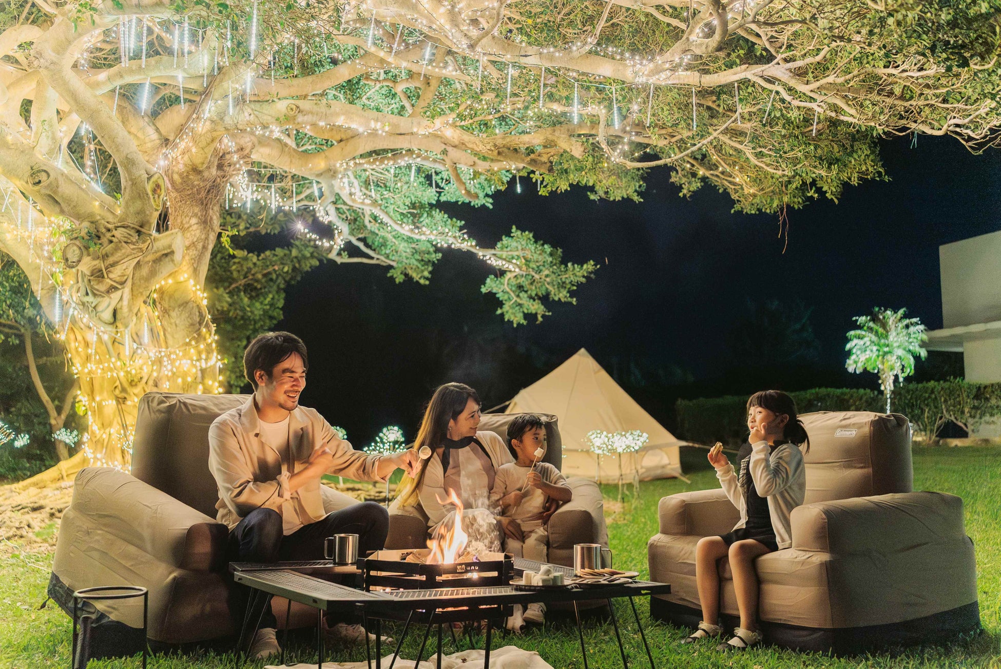 訪れる人を優しく包み込むように、ゆったりと枝を広げるガジュマルの樹の下、金色に煌めくイルミネーションを眺めながら静かに語り合ったり、スモアづくりに挑戦するなど、大人から子供、カップルやファミリーまで誰もが楽しめる空間です。