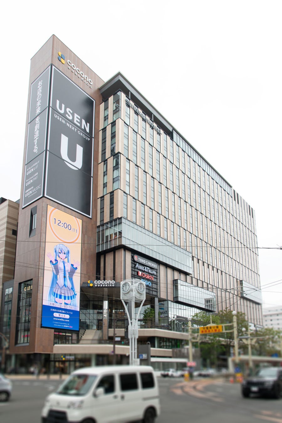 リニューアルまでは現在放映中の「雪ミク時報」を引き続きお楽しみいただけますので、「COCONO SUSUKINO」前を通行される際は、ぜひ屋外デジタルボードにもご注目ください。現在は1日4回(8時/12時/15時/19時)、方言を交えながら皆さまに時間をお知らせしております。