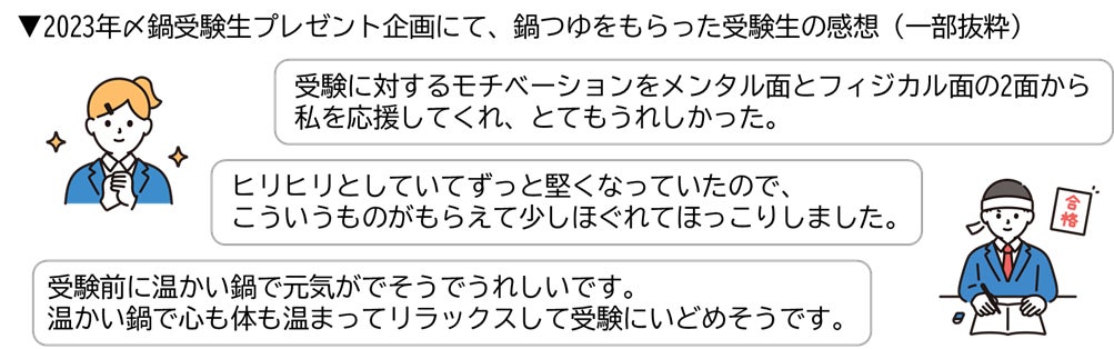 本商品の企画は、お客様の声から始まりました。お客様相談センターには、受験期に「〆まで美味しい鍋つゆ」をご利用いただいた方からお礼のご連絡をいただいています。また、2023年に〆鍋ブランドで実施した受験生への鍋つゆプレゼント企画でも、多くの受験生から喜びの声を頂戴しました。