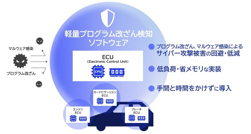 自動車のエンジンやブレーキ、カーナビゲーションなど様々な機能を制御するECUは、CPU性能や搭載するメモリリソースが限られています。そのため、ECU本来の動作を阻害せず、メモリリソースを逼迫させずにプログラム改ざんやマルウェア感染の対策を搭載することは、自動車メーカーや部品メーカーにとって大きな課題となっていました。本製品は、高速・低負荷な動作により、ECUの動作に掛かる負荷を抑え、プログラムサイズが小さいことで、省メモリな実装が可能です。