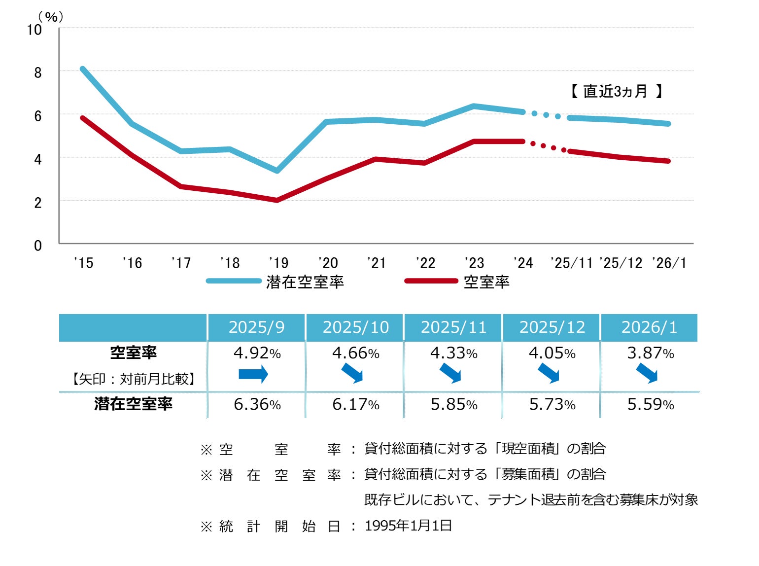 空室率は前月比マイナス0.18ポイントの3.87%と4ヵ月連続で低下し、2023年1月以来の3%台となった。新築ビルを中心に空室消化が進み、主な低下要因となっている。エリア別では「天神」が前月比マイナス1.1ポイントと大幅に低下した。潜在空室率は前月比マイナス0.14ポイントの5.59%だった。