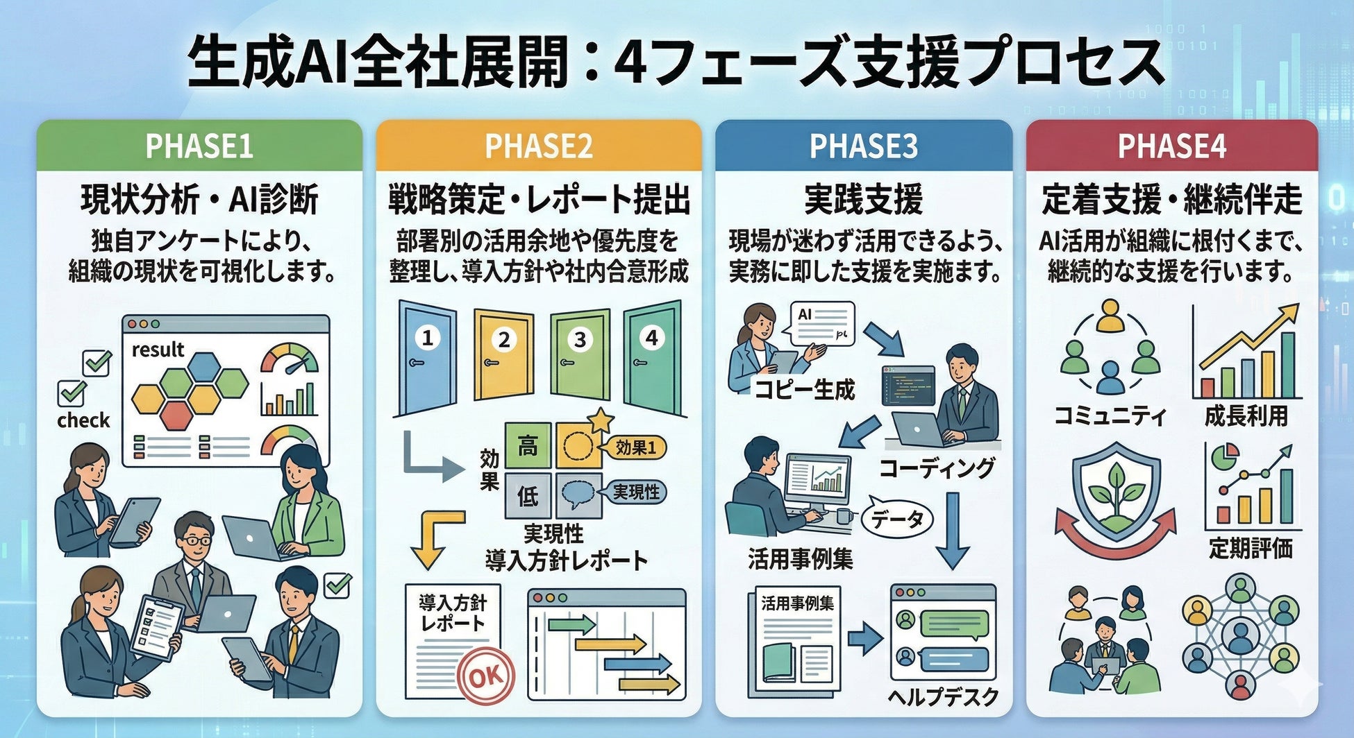 当社は、生成AI導入に苦戦を強いられている企業を対象に、企業専用アンケートによる現状可視化、部署別の導入優先度設計、実践支援、定着支援までを一気通貫で行う法人向けAI導入支援サービスの提供を開始しました。