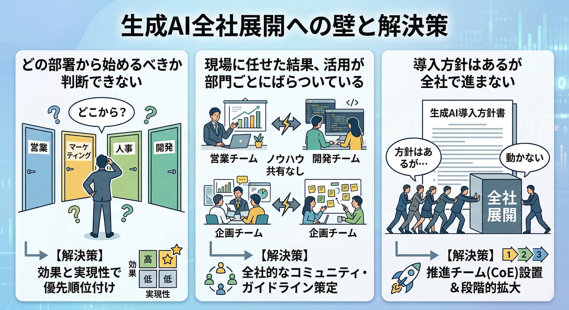 企業が生成AI導入を進める上で、「社員のAIリテラシーが低く使いこなせない」「どの部署から始めればよいか分からない」「成功事例が横展開されず個人止まりになる」「導入コストに対して効果が見えにくい」といった課題が発生しやすくなります。これらは単独の部門判断やツール導入だけでは解決できず、経営視点での優先順位整理と組織設計が求められます。