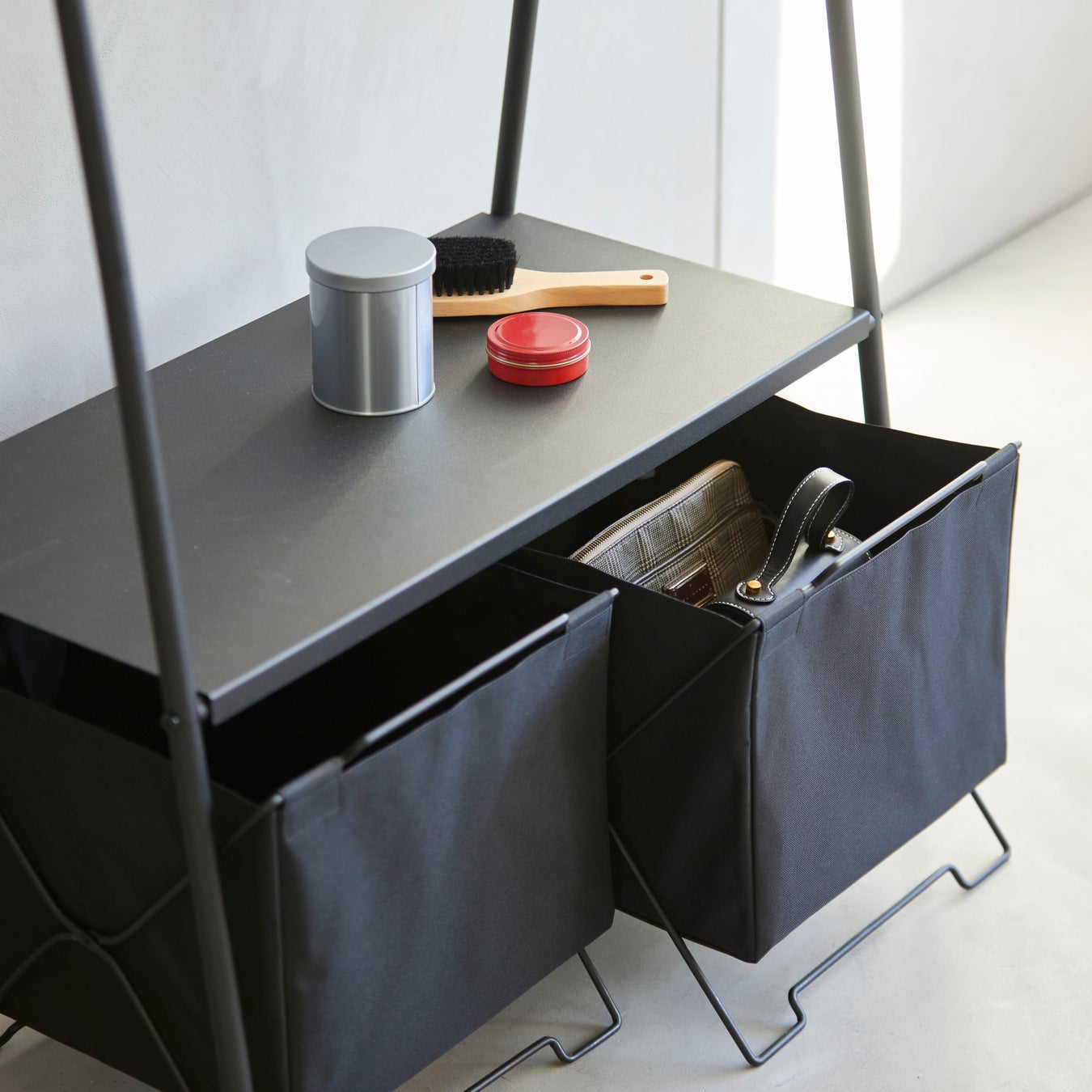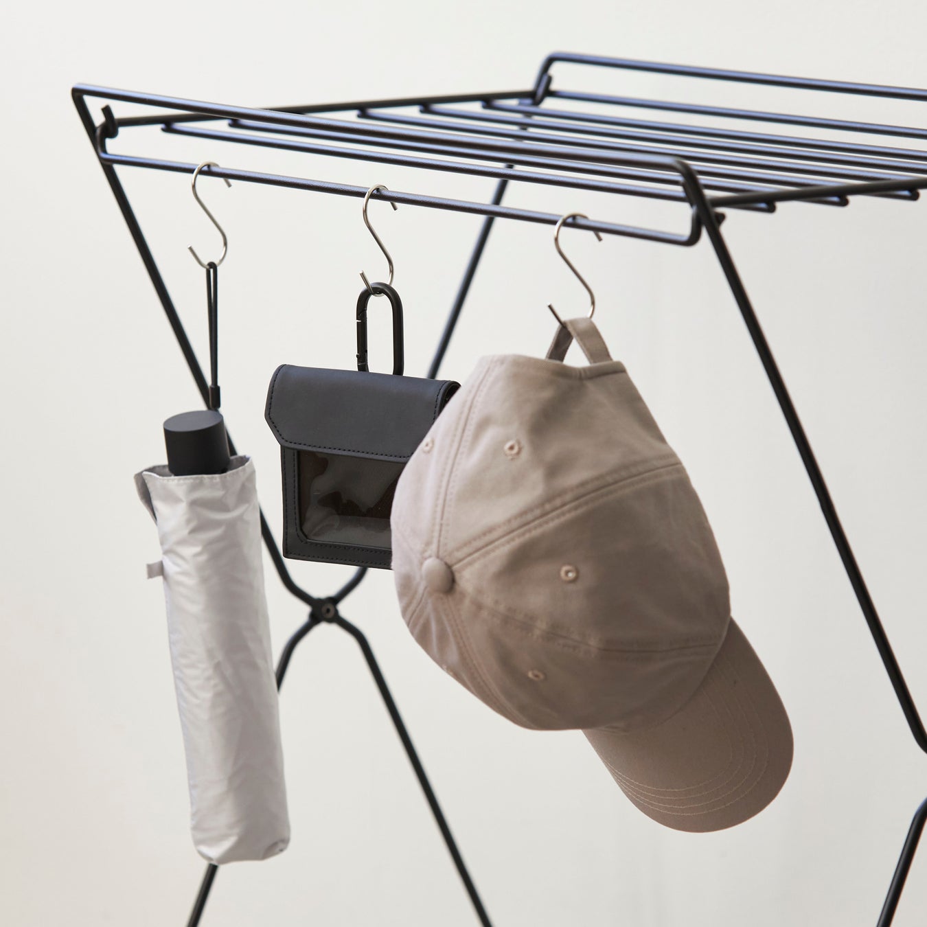また、棚板の上に本などの小物を置いたり、S字フックを取り付けて帽子や折りたたみ傘などをかけて収納したりすることもでき、「掛ける、置く、吊るす」の3パターンの収納が可能です。