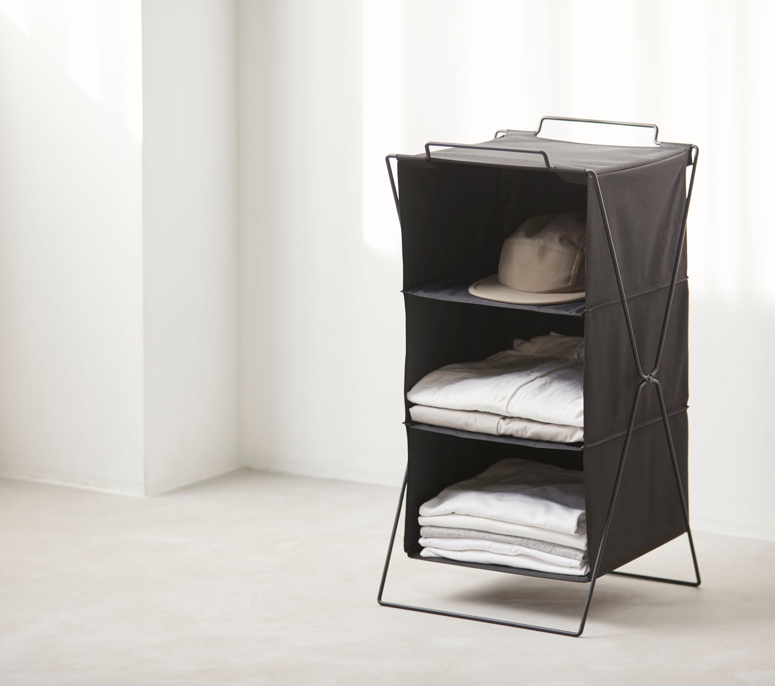 シャツ、帽子、ミニバッグなどの衣類を種類ごとに分けて収納できます。縦の空間を活かした収納ができ、中身が見やすく正面から簡単に取り出せます。また、取っ手がついているので移動も簡単です。