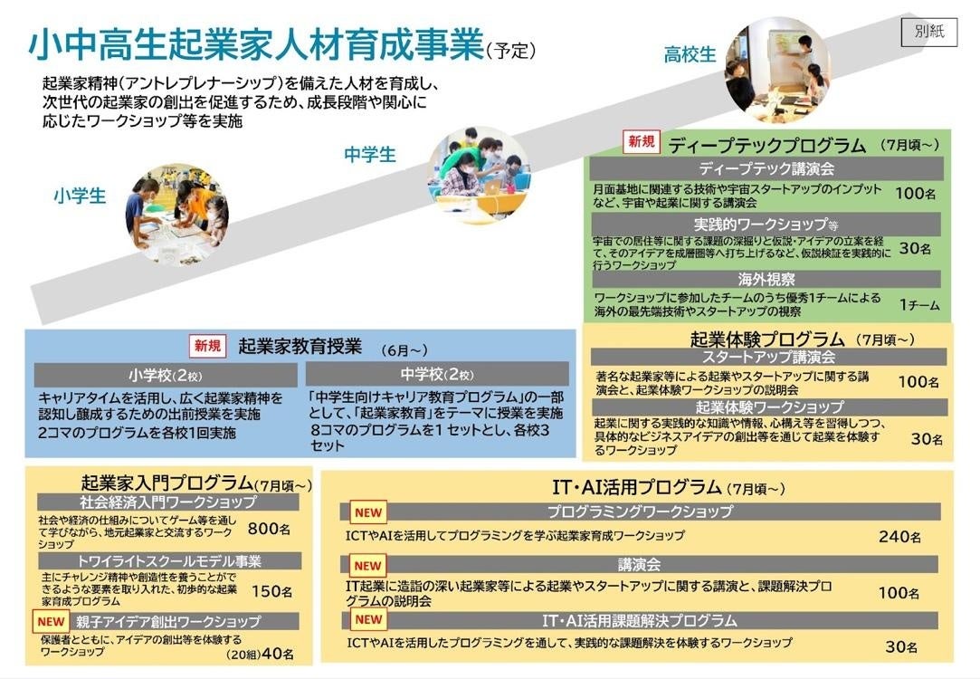 そして今年度から新たに、起業に関心を持つ人材をさらに増やすため、教育委員会が実施するキャリア教育の取組みと連携し、学校現場において人生の多様な選択肢のうちの一つとしての起業を知り、起業意識を芽生えさせるための教育の機会を提供することになりました。