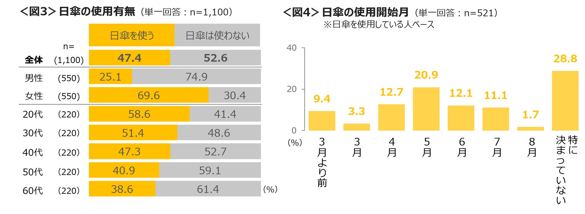 日傘を使っている人は47.4%で、使い始める時期は「5月」が20.9%。