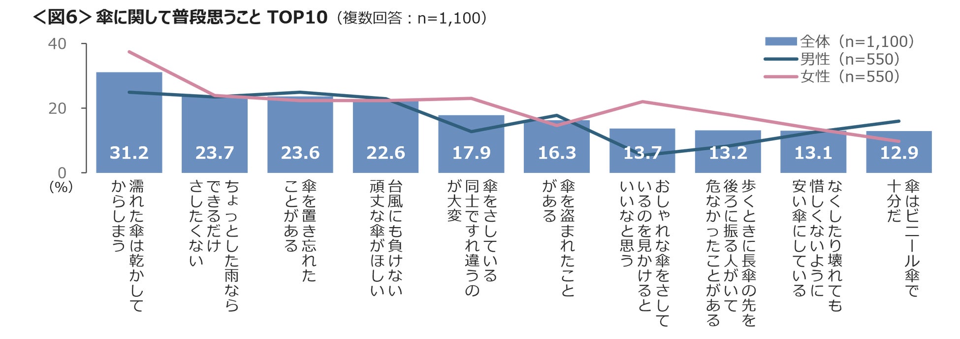 女性は「おしゃれな傘をさしているのを見かけるといいなと思う」が高く、傘はおしゃれアイテムのひとつとして考えている。<図6>