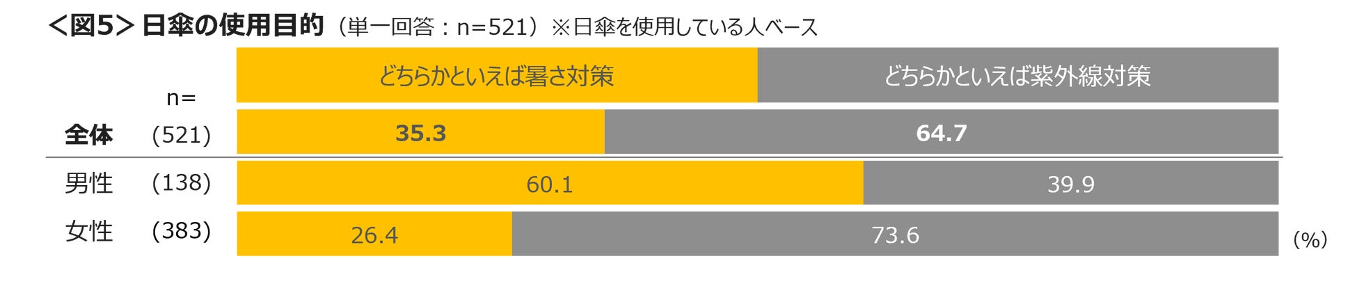 男性は「暑さ対策」、女性は「紫外線対策」で使用している。<図5>
