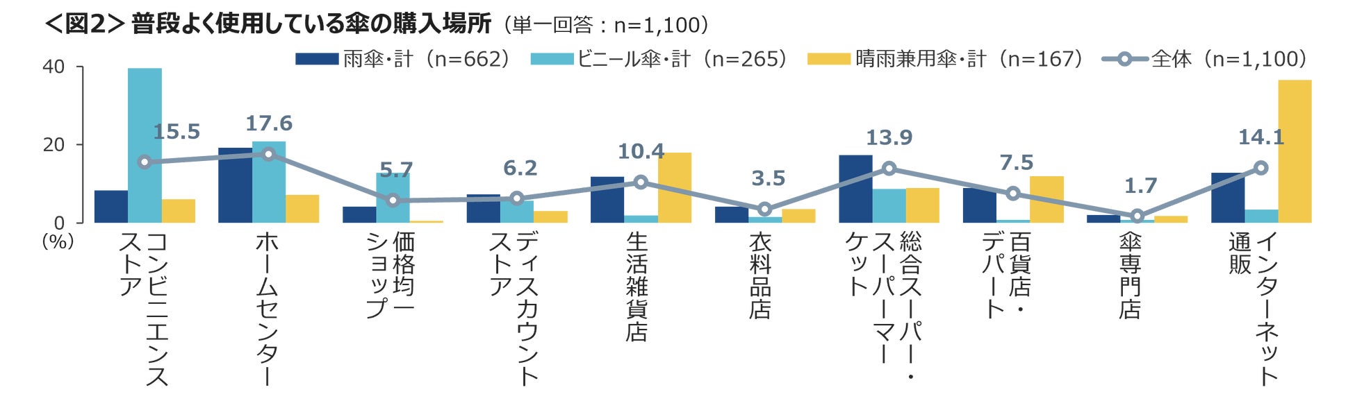 雨傘は「ホームセンター」「総合スーパー・スーパーマーケット」、ビニール傘は「コンビニエンスストア」、晴雨兼用傘は「インターネット通販」で購入。<図2>