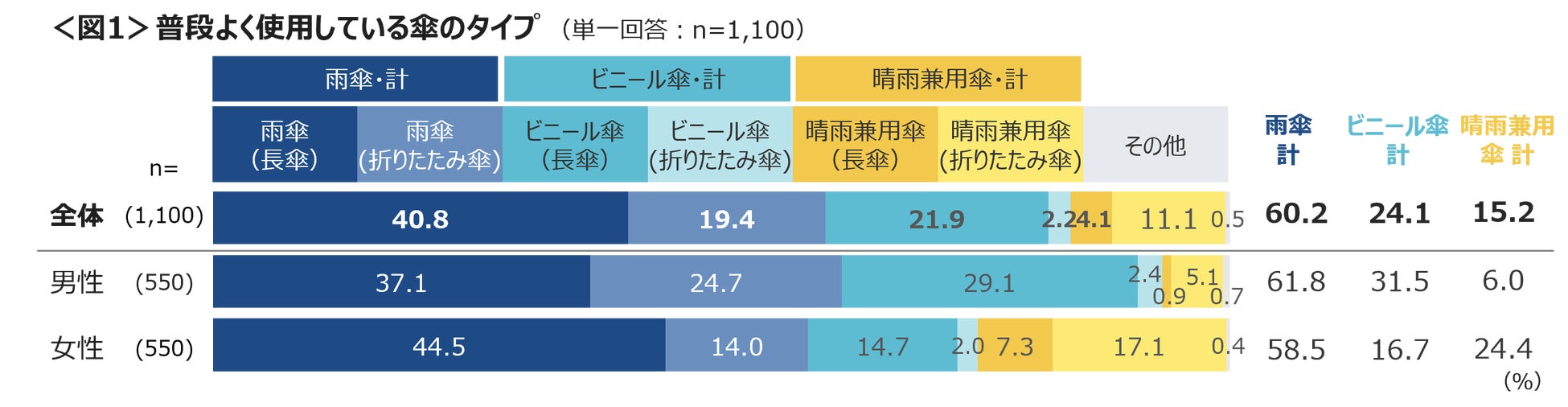 男性は「ビニール傘(長傘)」、女性は「晴雨兼用傘(折り畳み傘)」が高め。<図1>
