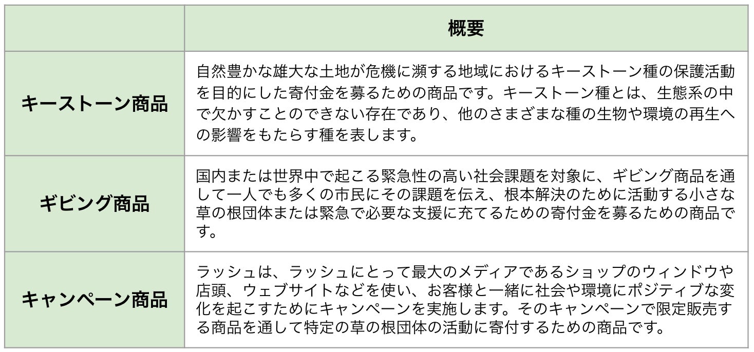 新たなギビング商品スキームになることで、お客様は商品購入時に具体的な社会課題とその課題解決のために活動する団体の情報を把握することができ、より直接的に社会課題の解決にお客様が意思をもって関わることができるようになります。ラッシュは、人権や社会正義、動物の権利、環境保護活動など、世界中の様々な社会課題の根本解決に向けて活動する団体やアクティビストを応援するべく、ギビング商品スキームを活性化していきます。