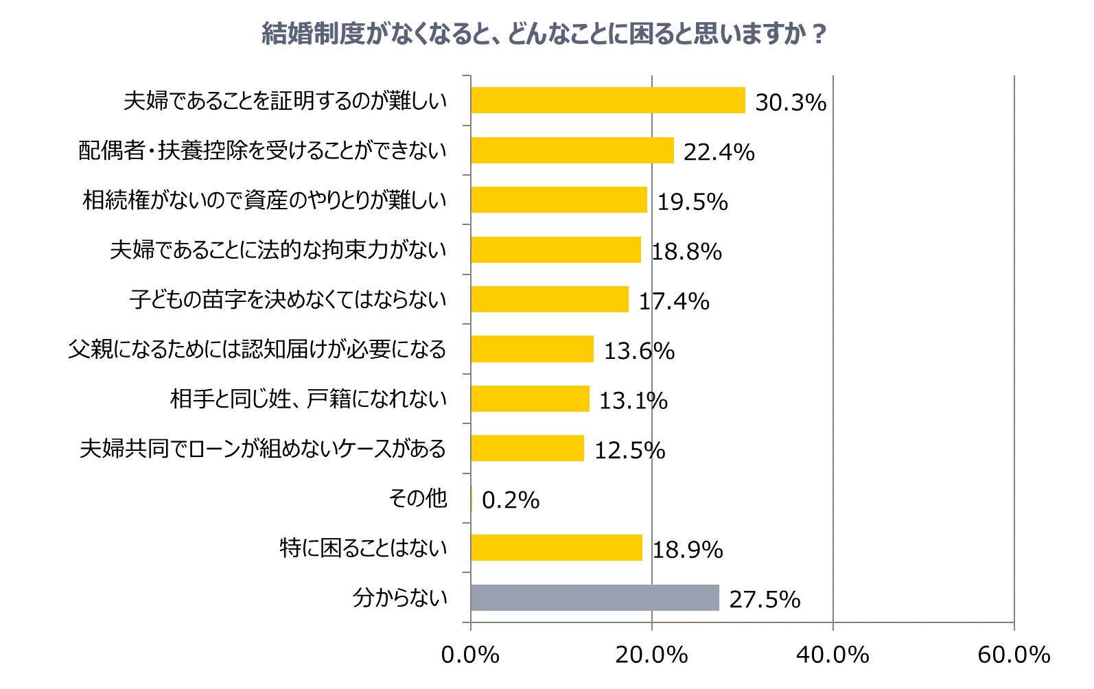 最も多かったのが「夫婦であることを証明するのが難しい」で30.3%、続いて「配偶者・扶養控除を受けることができない」が22.4%、「相続権がないので資産のやりとりが難しい」が19.5%でした。