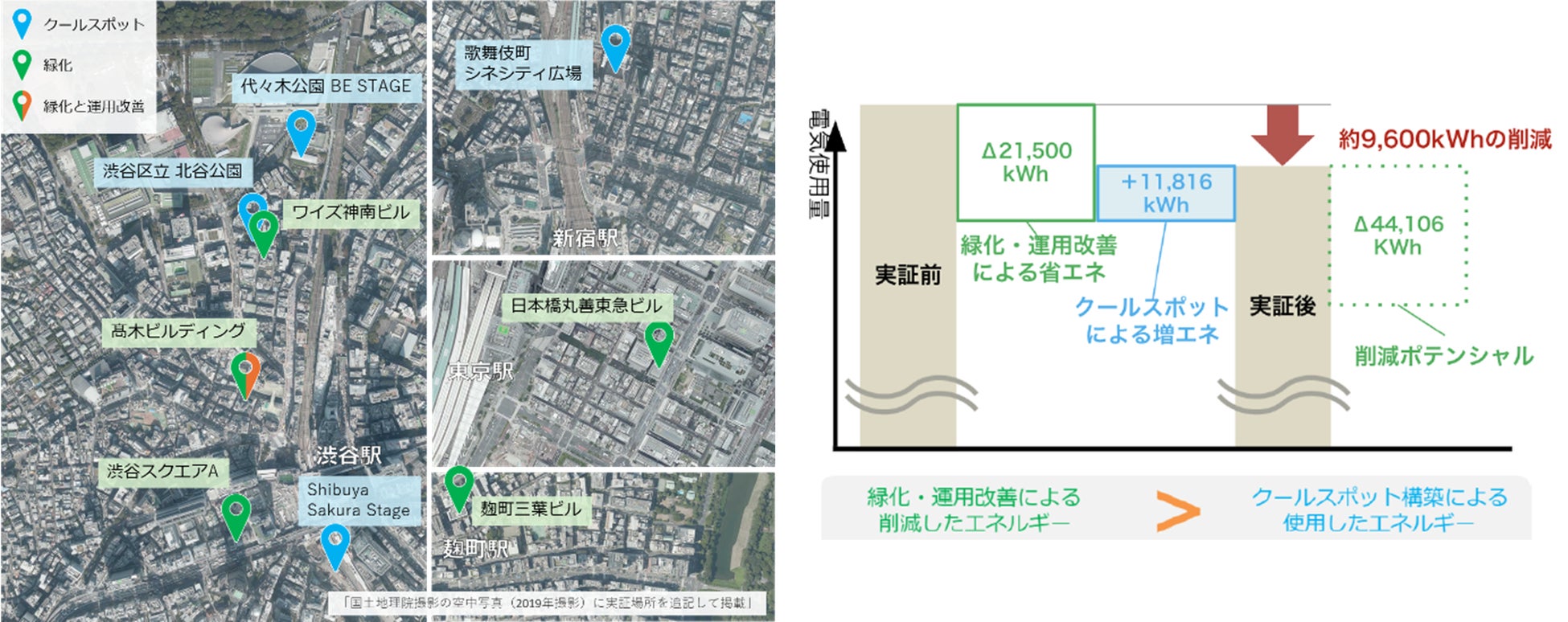 クールスポットの設置で増えるエネルギー消費(増エネ)を上回る節電効果を目指し、ビル屋上での緑化や空調の運用改善などで省エネ施策を実証しました。