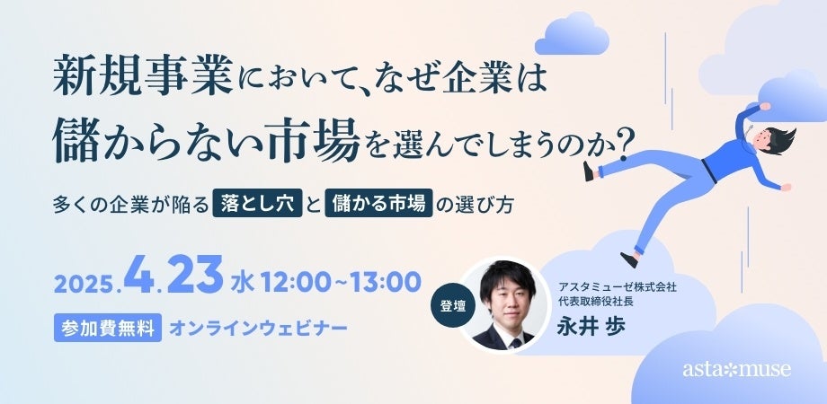 アスタミューゼ株式会社(本社:東京都千代田区、代表取締役社長 永井歩)は、2025年4月23日(水)12:00-13:00に、無料ウェビナー「新規事業において、なぜ企業は儲からない市場を選んでしまうのか? ~多くの企業が陥る落とし穴と儲かる市場の選び方~」を開催いたします。