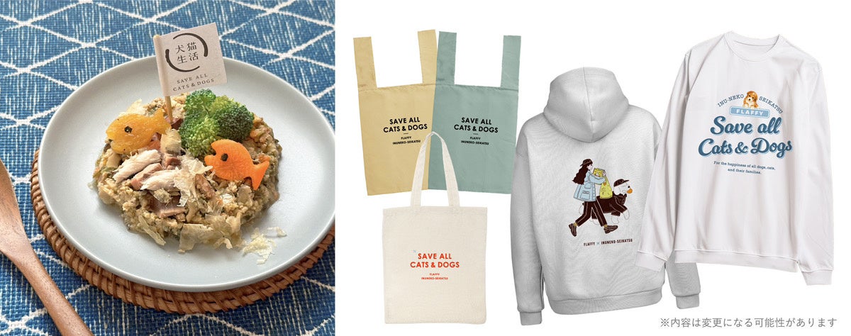 本イベントでは、国産無添加の犬猫ご飯の販売や動物福祉財団を設立した犬猫生活株式会社監修のワンちゃん用の海鮮丼「チャリティー海鮮丼」と、ヒト用の「チャリティーTシャツ」を販売いたします。